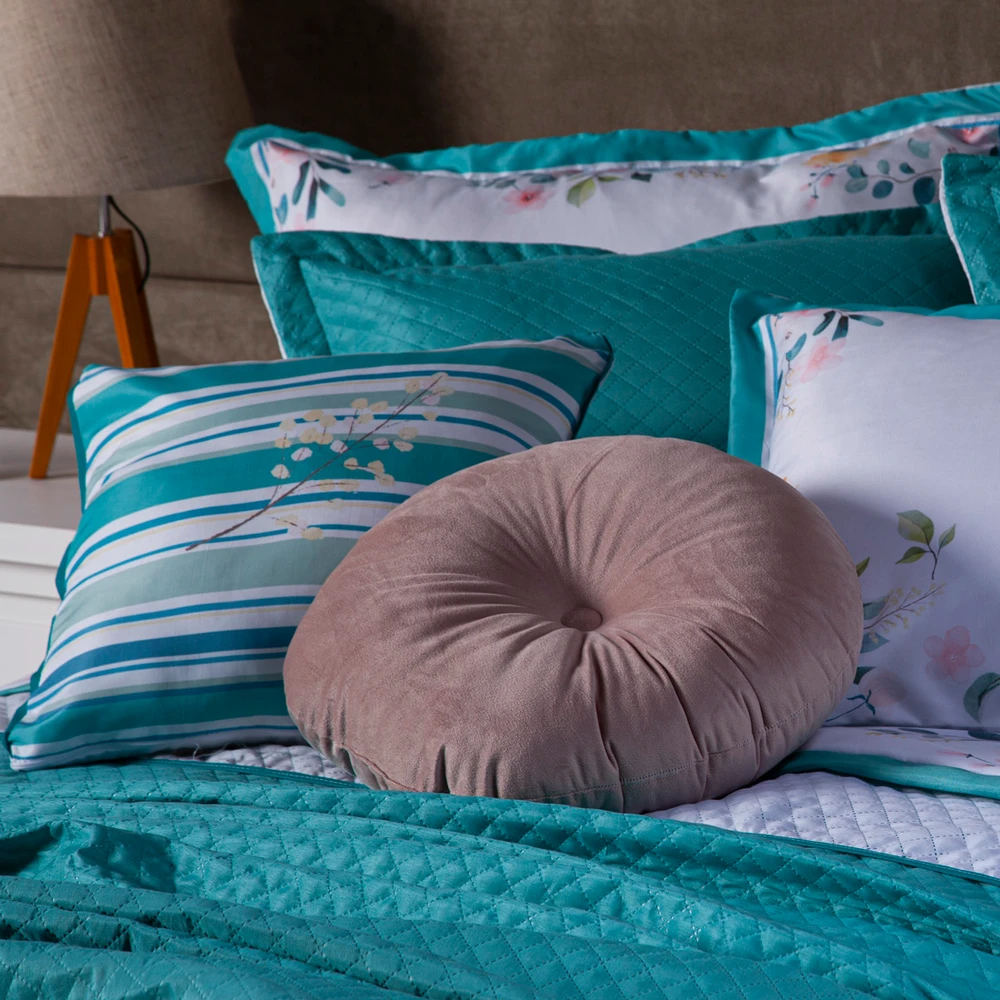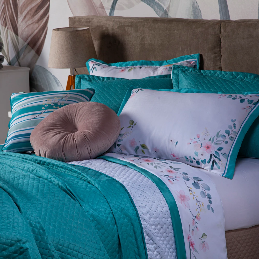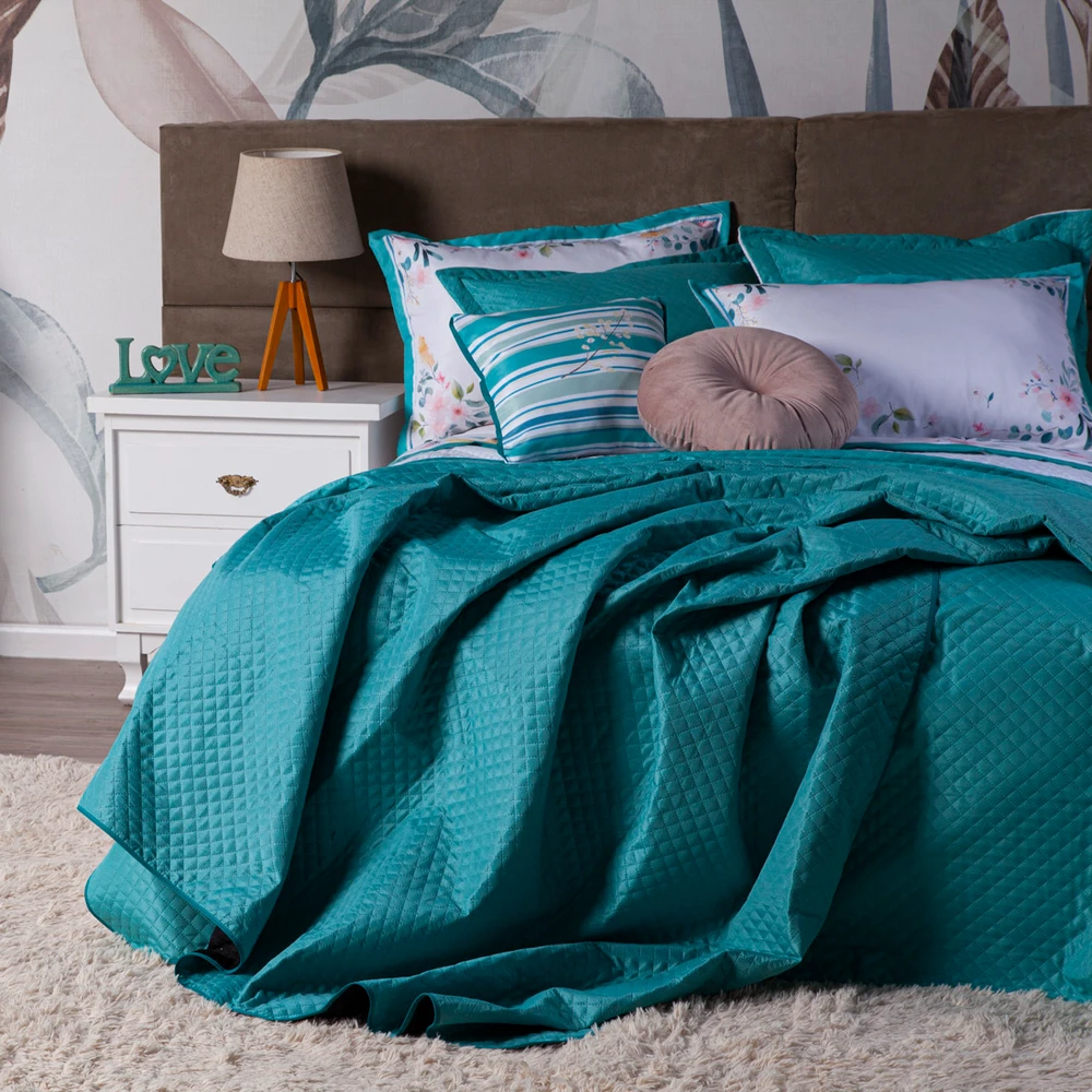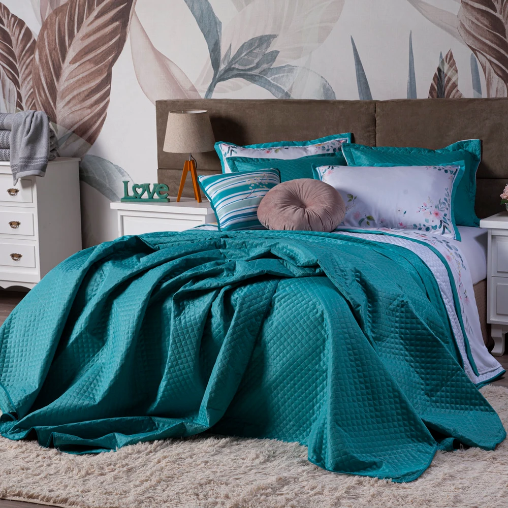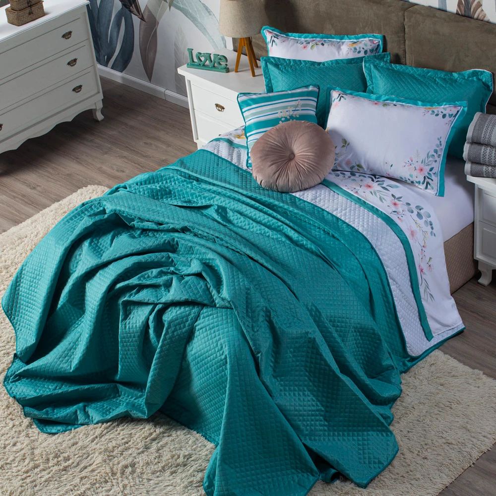 Confeccionado em tecido Microfibra 100% Políester, a nova Coleção Fanari vem trazendo um toque macio, com portas estampados em acabamento debrum, o cobre leito com enchimento em manta dupla face, permitindo o uso dos dois lados (Tiffany e Branco) com lindos detalhes nos porta-travesseiros matelados e na almofadinha estampada com viés, acompanhando também uma linda almofada redonda em veludo, aquele toque perfeito para trazer conforto e beleza na sua decoração. Tudo para combinar com a sua cama! Produzido num rigoroso controle de qualidade, dando um toque de requinte para o ambiente. Confira!