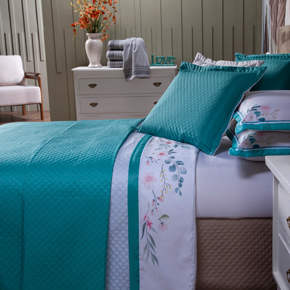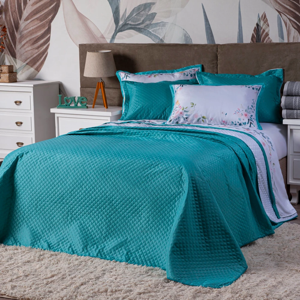 Confeccionado em tecido Microfibra 100% poliéster, a nova Coleção Fanari vem trazendo um toque macio, com portas travesseiros matelados em acabamento debrum, o cobre leito com enchimento em manta dupla face, permitindo o uso dos dois lados (Tiffany e Branco) com lindos detalhes nas fronhas estampadas e na vira de lençol em floral, tudo para combinar com a sua decoração! Produzido num rigoroso controle de qualidade, dando um toque de requinte para o ambiente. Confira!