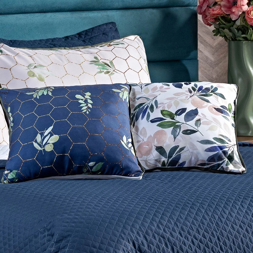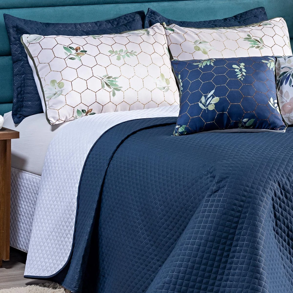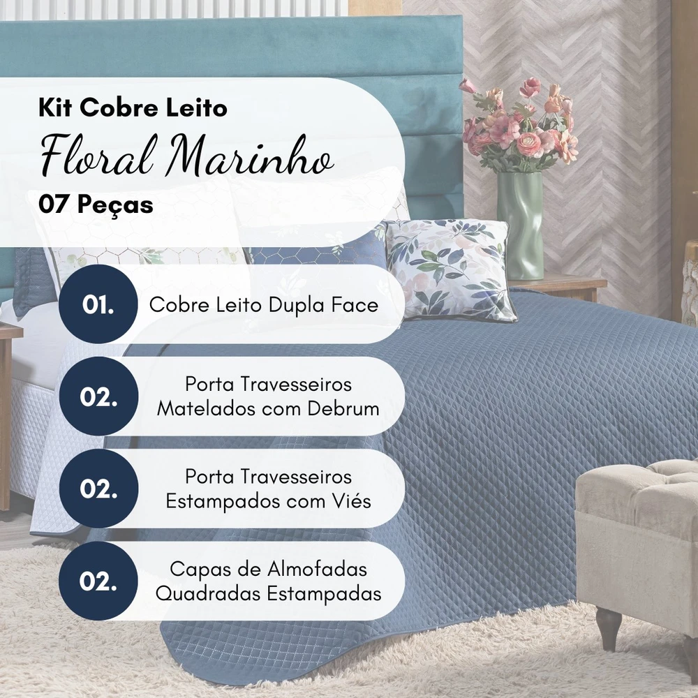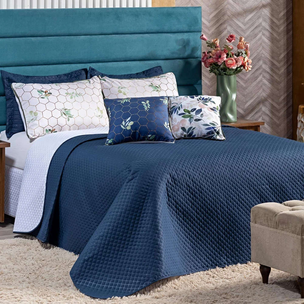 Apresentamos o Kit Cobre Leito Floral Azul Marinho, uma adição encantadora e sofisticada para a seu quarto. Este conjunto conta com sete peças meticulosamente selecionadas para elevar o visual do seu ambiente. Com um design floral e geométrico em tons serenos de azul marinho, este conjunto traz uma sensação de frescor e elegância ao seu quarto. A face dupla oferece versatilidade, permitindo que você alterne entre os estilos conforme desejar. O kit inclui um cobre leito acolchoado, dois porta-travesseiros matelados com debrum, dois porta-travesseiros decorativos estampados e duas capas de almofadas estampadas temáticas, proporcionando um conjunto completo de elementos coordenados para a sua cama. Combinando estilo e conforto, este kit é a escolha perfeita para quem busca adicionar um toque de charme e serenidade ao seu refúgio pessoal. Confira!