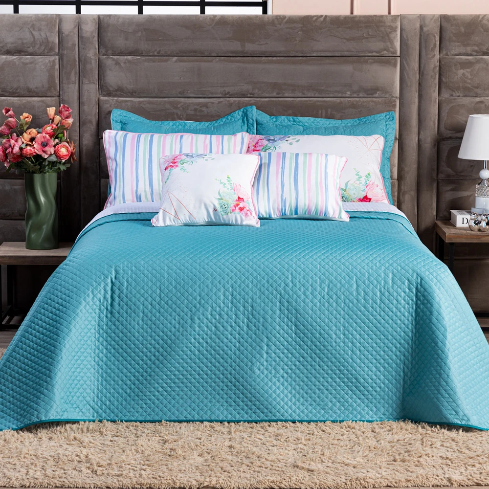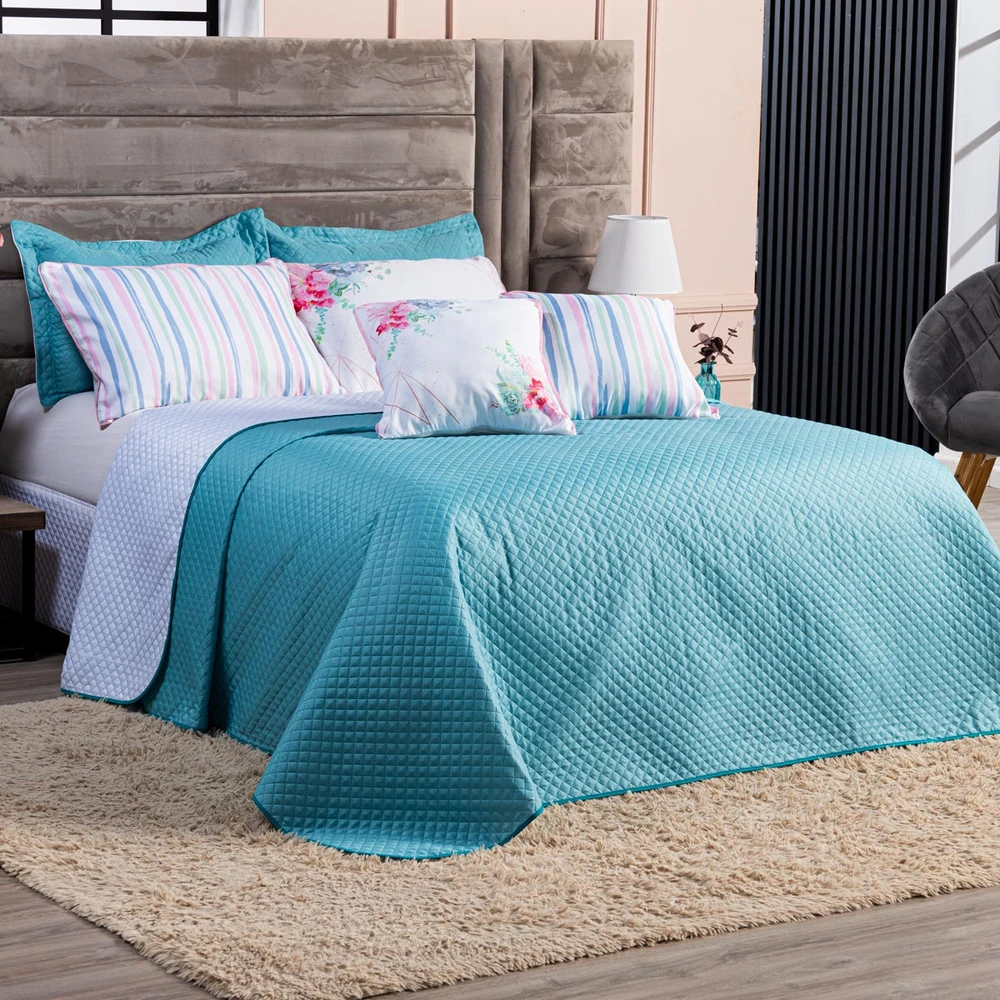 Confeccionado em tecido Microfibra Poliéster, a nova Coleção Floral Tiffany vem trazendo um toque macio, com portas em acabamento debrum, o cobre leito com enchimento em manta dupla face, permitindo o uso dos dois lados (Tiffany e Branco), com lindos detalhes nos porta-travesseiros estampados floral e listrados com viés em toda a volta, tudo para combinar com a sua decoração! Acompanhando também duas lindas capas de almofadas estampadas temáticas, todas com ziper para facilitar a lavagem e a montagem do dia a dia. Produzido num rigoroso controle de qualidade, dando um toque de requinte para o ambiente. Confira!