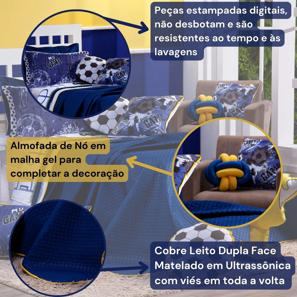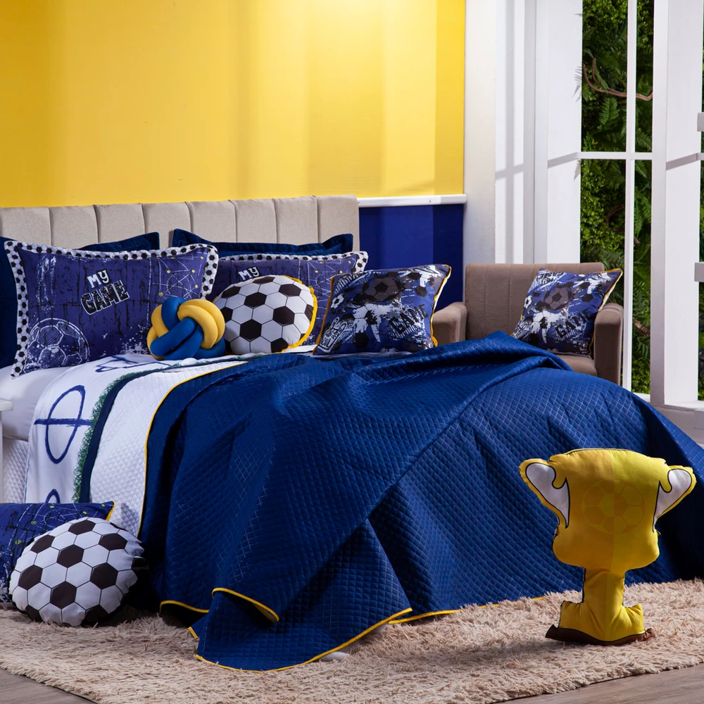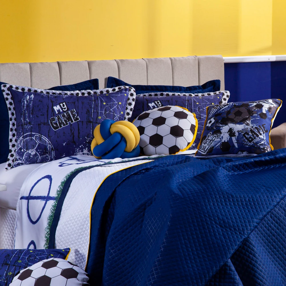 A Nova Coleção Futebol Game em Microfibra tem um toque suave e macio, o tecido caracteriza-se por ser muito leve, confortável, sedoso, com secagem rápida e ótimo caimento. Vem trazendo estilo para a decoração de seu quarto na nova tendência Dupla Face, podendo utilizar as 2 cores do cobre leito! Ficará de ótimo bom gosto e elegância, acompanhando porta-travesseiros, duas almofadinhas estampadas super modernas e temáticas e uma almofada de nó em 2 cores! Tudo para combinar com a decoração, perfeito para dar aquele upgrade no ambiente ou para presentear o Jogador que você ama! Confira!
