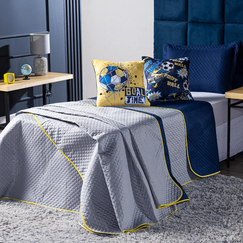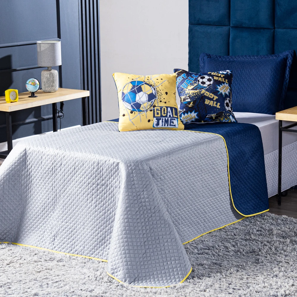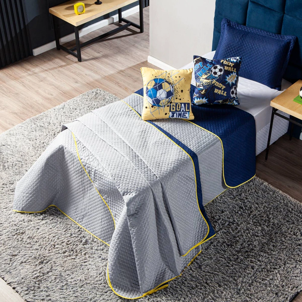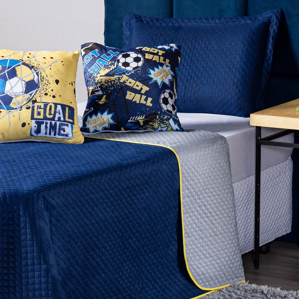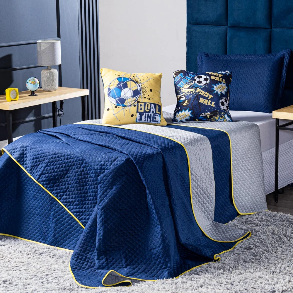 Confeccionado em tecido Microfibra Poliéster, a nova Coleção Futebol Goal vem trazendo um toque macio, com portas em acabamento debrum, o cobre leito com enchimento em manta dupla face, combinando cores modernas, permitindo o uso dos dois lados (Azul Marinho e Cinza), tudo para combinar com a sua decoração! Acompanhando duas lindas capas de almofadas estampadas digitais com zíper, facilitando a lavagem e o seu dia a dia para montar a cama do seu jeito! Produzido num rigoroso controle de qualidade, dando um toque de requinte para o ambiente. Confira!