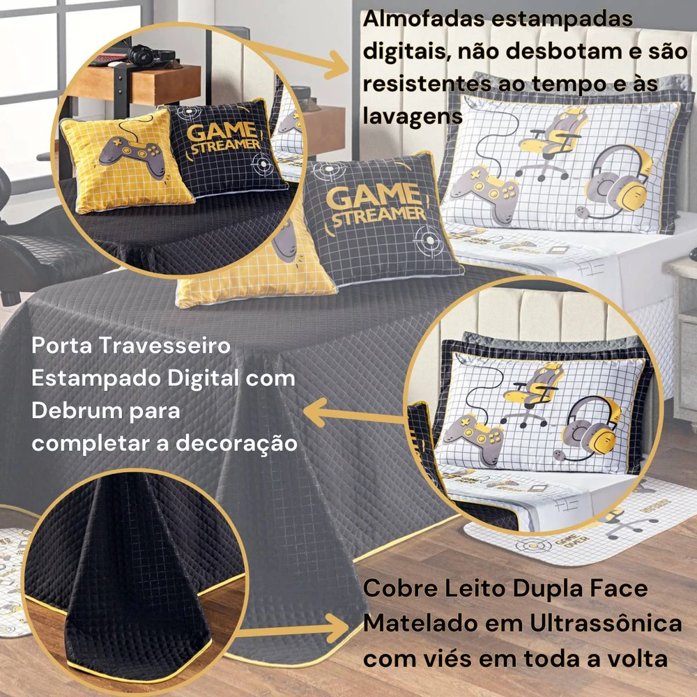 Kit Cobre Leito Game Streamer Dupla Face c/ Almofadas King 07 Peças