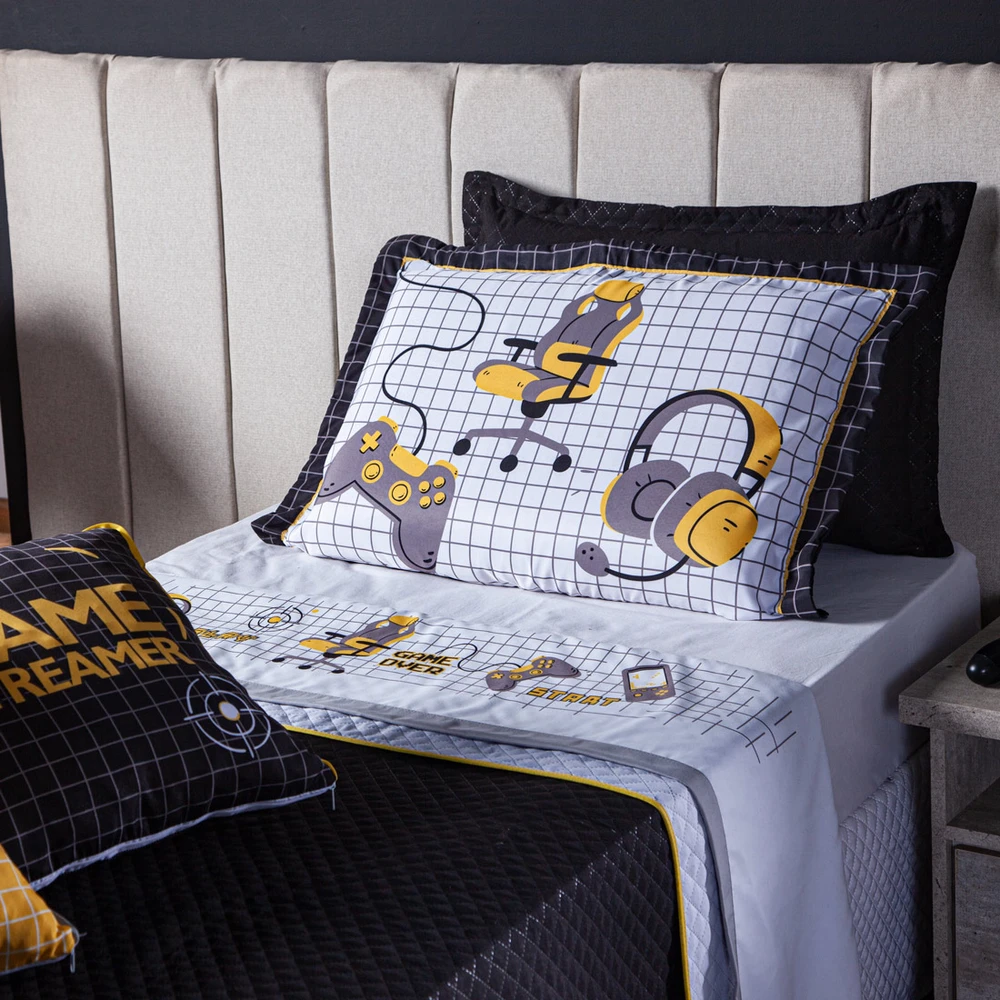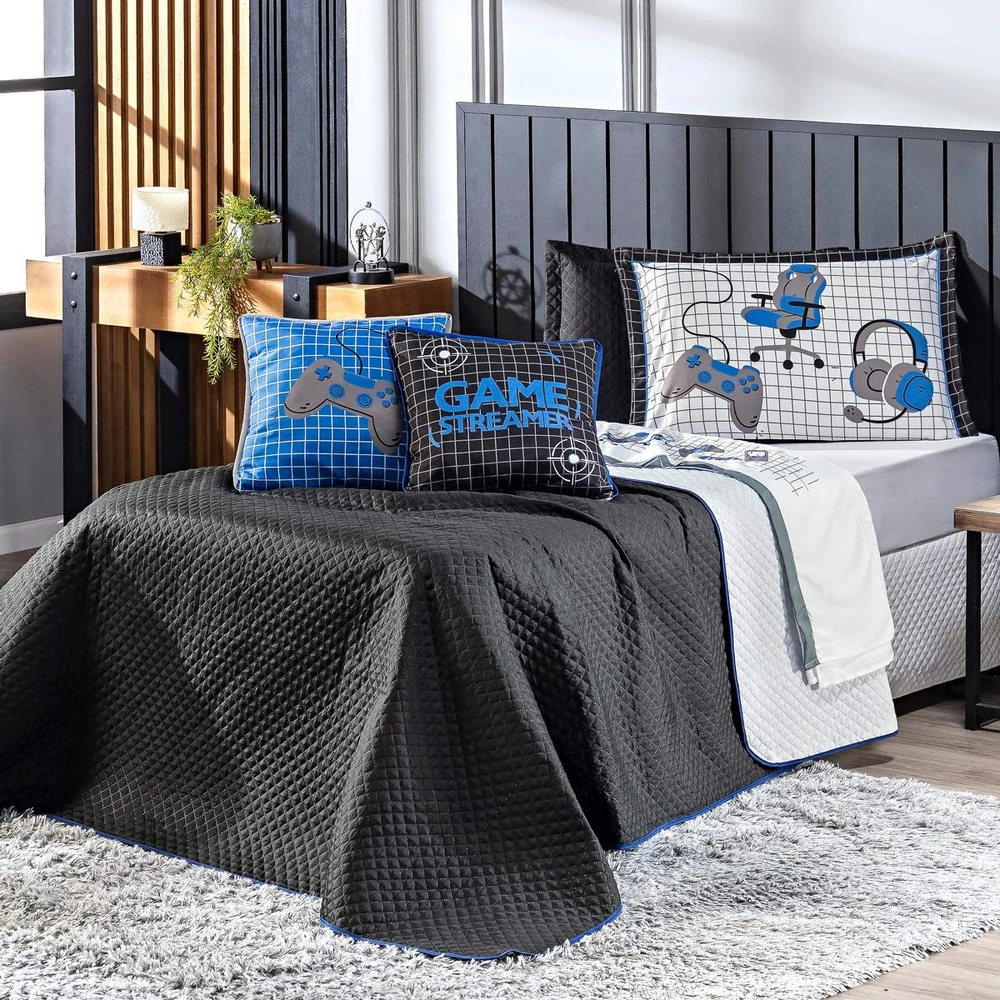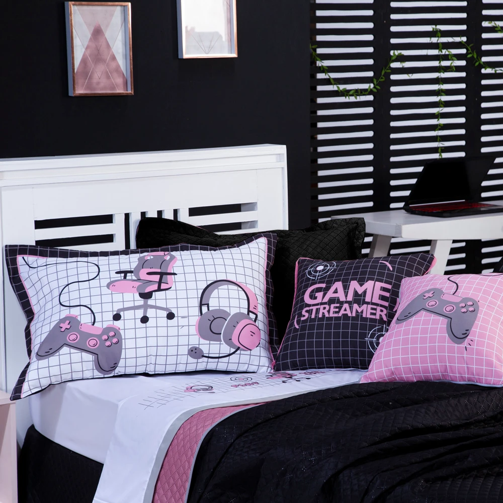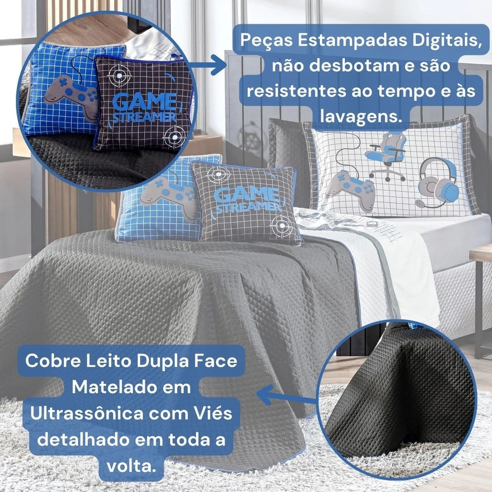 Kit Cobre Leito Game Streamer Dupla Face c/ Almofadas Solteiro 05 Peças