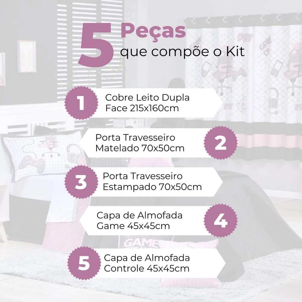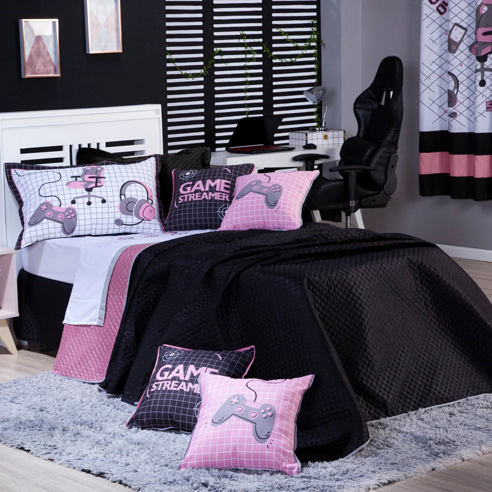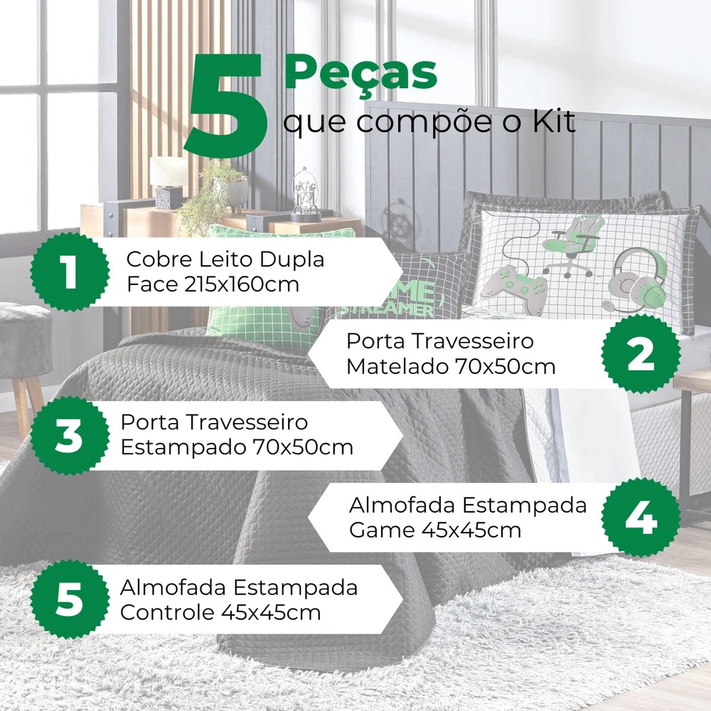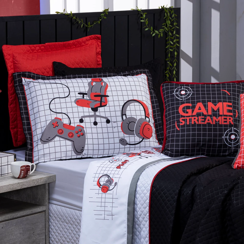 Kit Cobre Leito Game Streamer Dupla Face c/ Almofadas Solteiro 05 Peças