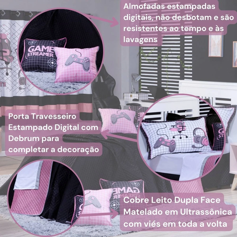 A Nova Coleção Game Streamer em Microfibra tem um toque suave e macio, o tecido caracteriza-se por ser muito leve, confortável, sedoso, com secagem rápida e ótimo caimento. Vem trazendo estilo para a decoração de seu quarto na nova tendência Dupla Face, podendo utilizar as 2 cores do cobre leito! Ficará de ótimo bom gosto e elegância, acompanhando porta-travesseiro e duas almofadinhas estampadas super modernas e temáticas! Tudo para combinar com a decoração, perfeito para dar aquele upgrade no ambiente ou para presentear o Gamer que você ama! Confira!