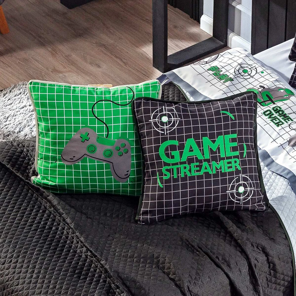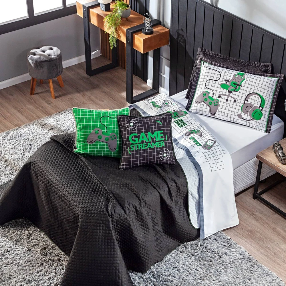Kit Cobre Leito Game Streamer Verde Dupla Face c/ Almofadas CASAL PADRÃO 07 Peças