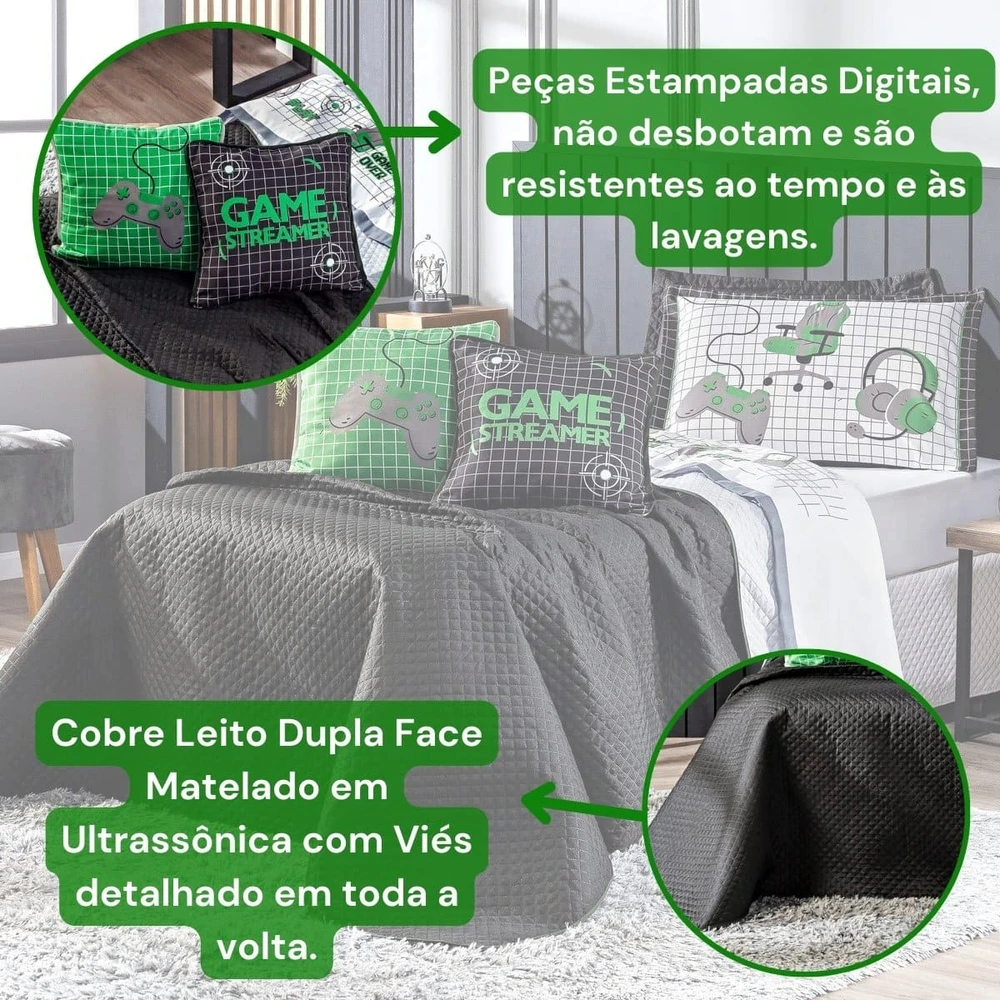 Kit Cobre Leito Game Streamer Verde Dupla Face c/ Almofadas SOLTEIRO 05 Peças