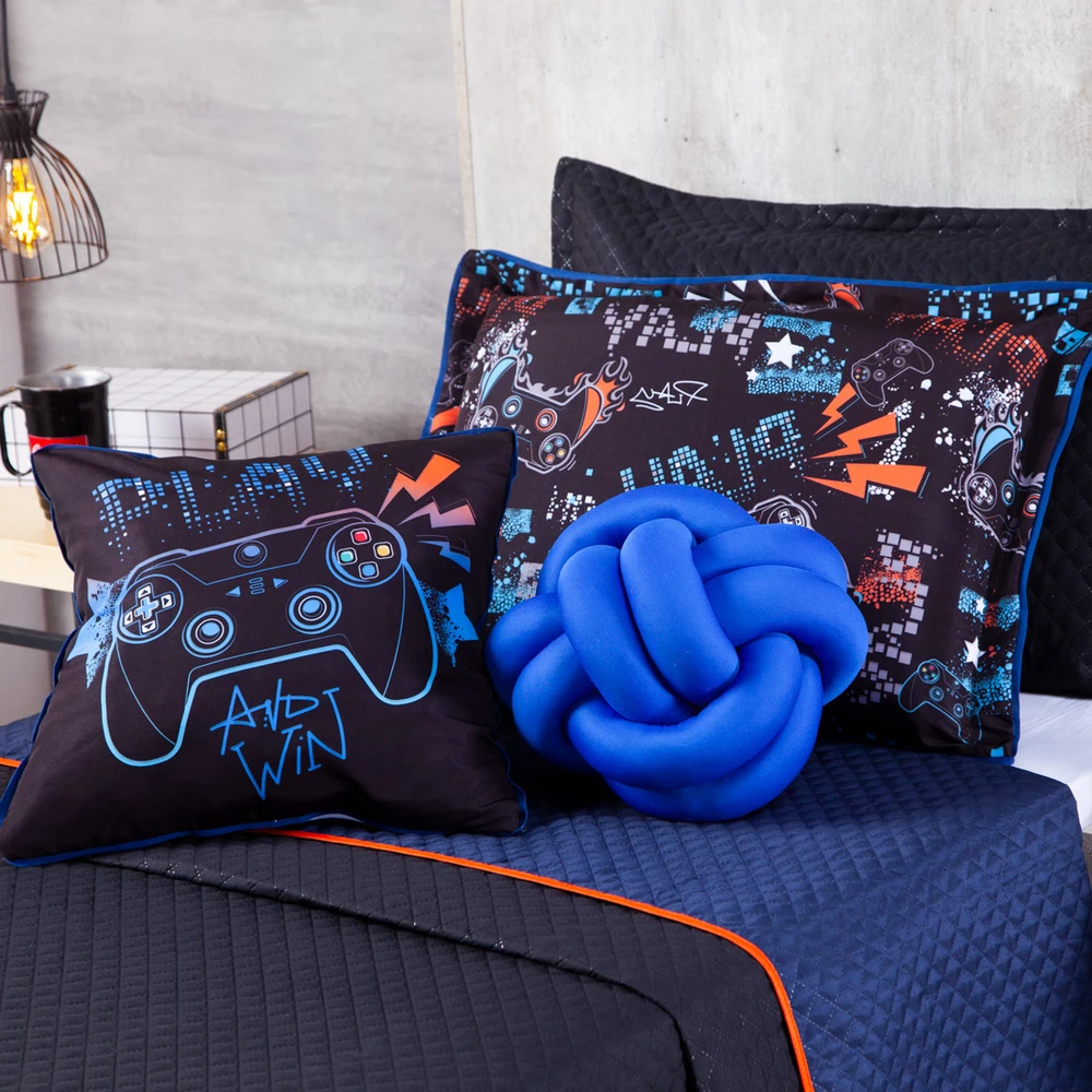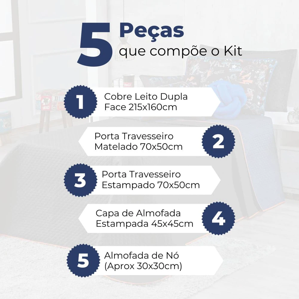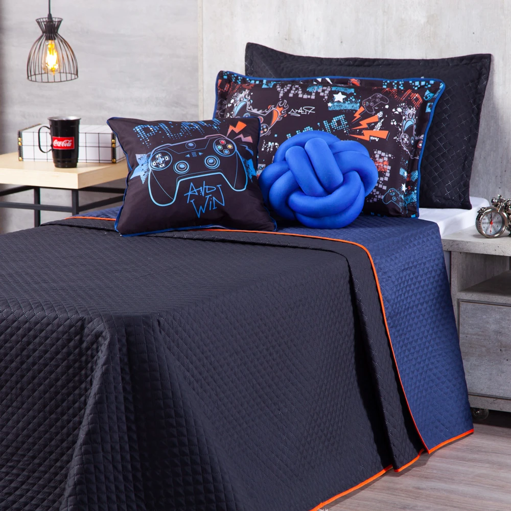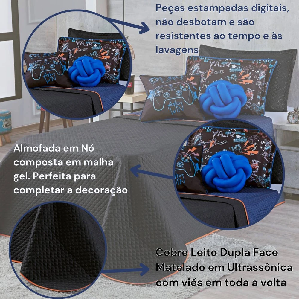 Kit Cobre Leito Game Win Preto/Marinho Dupla Face c/ Almofadas Solteiro 05 Peças