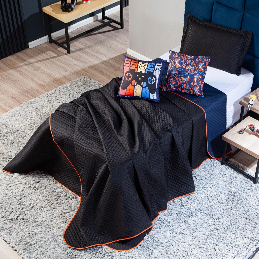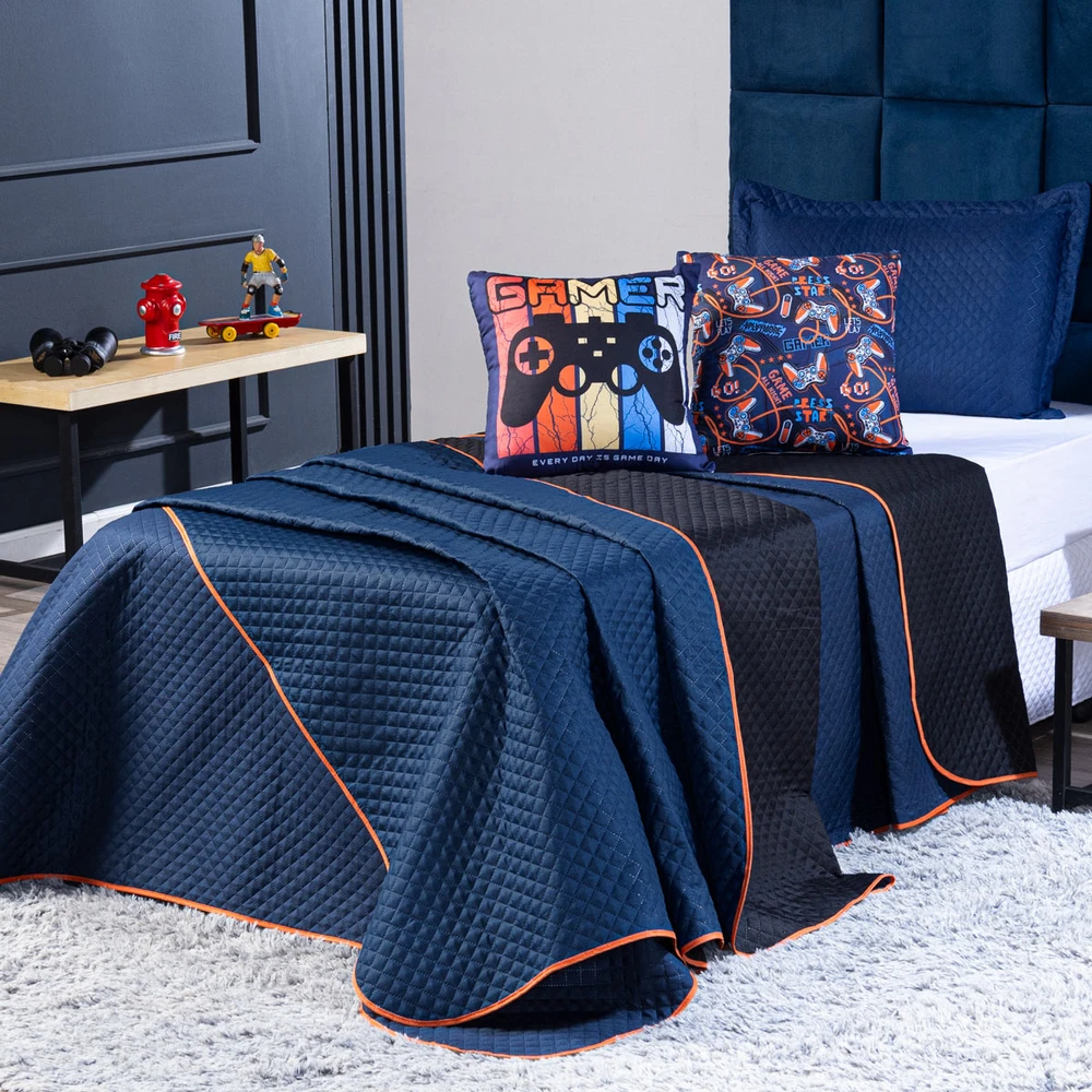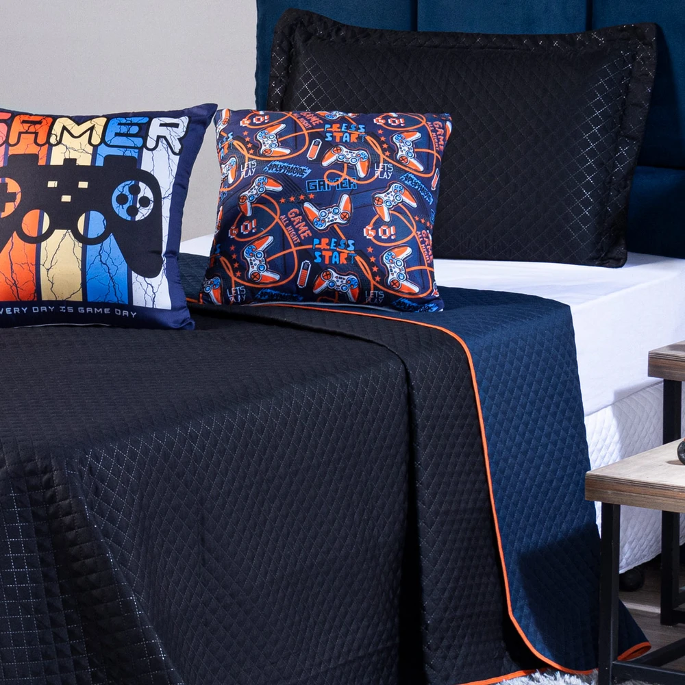 Confeccionado em tecido Microfibra Poliéster, a nova Coleção Gamer Day vem trazendo um toque macio, com portas em acabamento debrum, o cobre leito com enchimento em manta dupla face, combinando cores modernas, permitindo o uso dos dois lados (Preto e Azul Marinho), tudo para combinar com a sua decoração! Acompanhando duas lindas capas de almofadas estampadas digitais com zíper, facilitando a lavagem e o seu dia a dia para montar a cama do seu jeito! Produzido num rigoroso controle de qualidade, dando um toque de requinte para o ambiente. Confira!