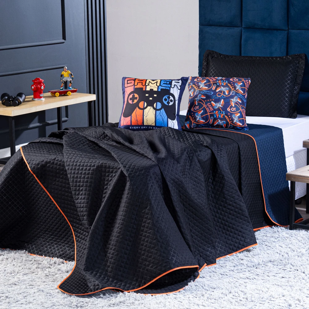 Confeccionado em tecido Microfibra Poliéster, a nova Coleção Gamer Day vem trazendo um toque macio, com portas em acabamento debrum, o cobre leito com enchimento em manta dupla face, combinando cores modernas, permitindo o uso dos dois lados (Preto e Azul Marinho), tudo para combinar com a sua decoração! Acompanhando duas lindas capas de almofadas estampadas digitais com zíper, facilitando a lavagem e o seu dia a dia para montar a cama do seu jeito! Produzido num rigoroso controle de qualidade, dando um toque de requinte para o ambiente. Confira!