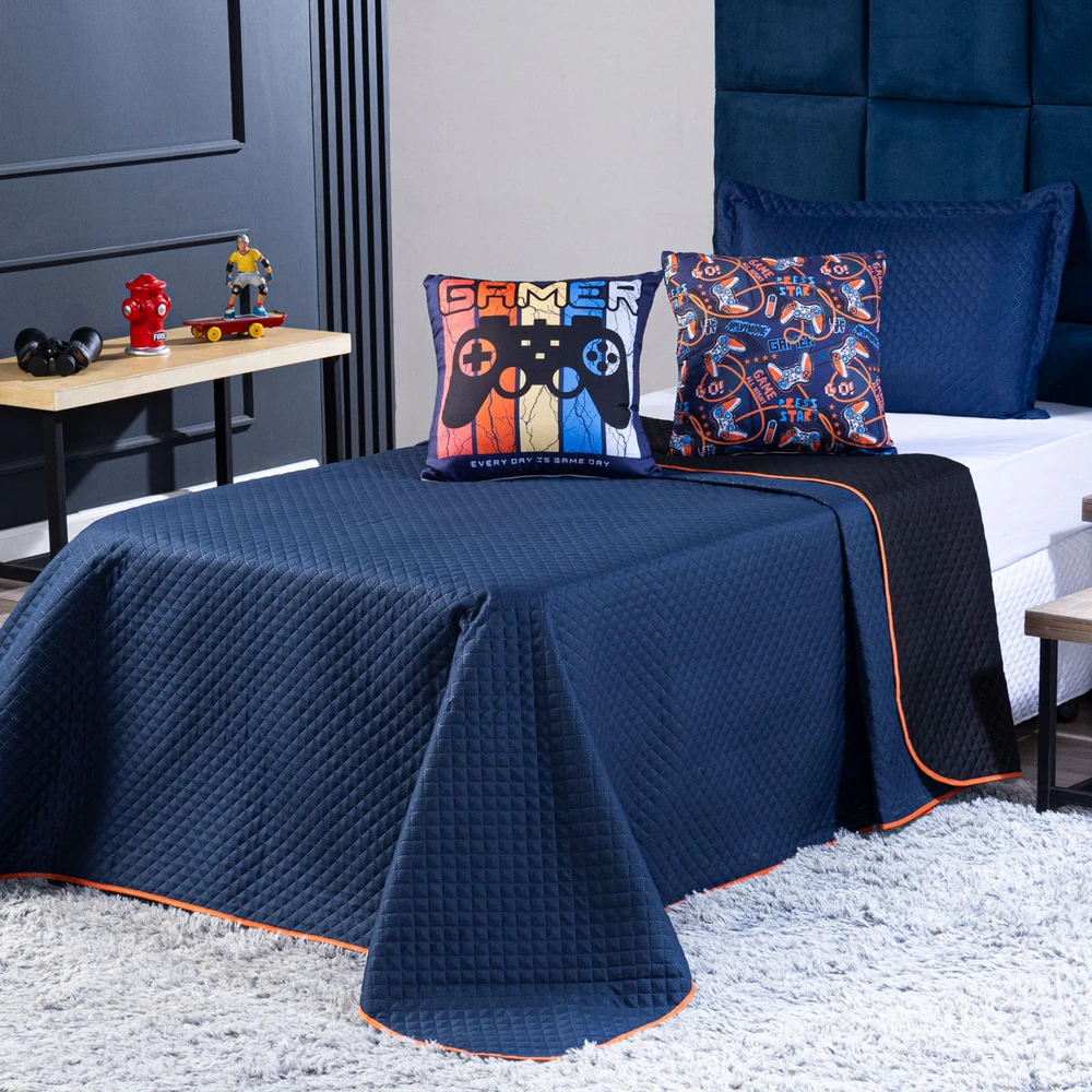 Confeccionado em tecido Microfibra Poliéster, a nova Coleção Gamer Day vem trazendo um toque macio, com portas em acabamento debrum, o cobre leito com enchimento em manta dupla face, combinando cores modernas, permitindo o uso dos dois lados (Preto e Azul Marinho), tudo para combinar com a sua decoração! Acompanhando duas lindas capas de almofadas estampadas digitais com zíper, facilitando a lavagem e o seu dia a dia para montar a cama do seu jeito! Produzido num rigoroso controle de qualidade, dando um toque de requinte para o ambiente. Confira!