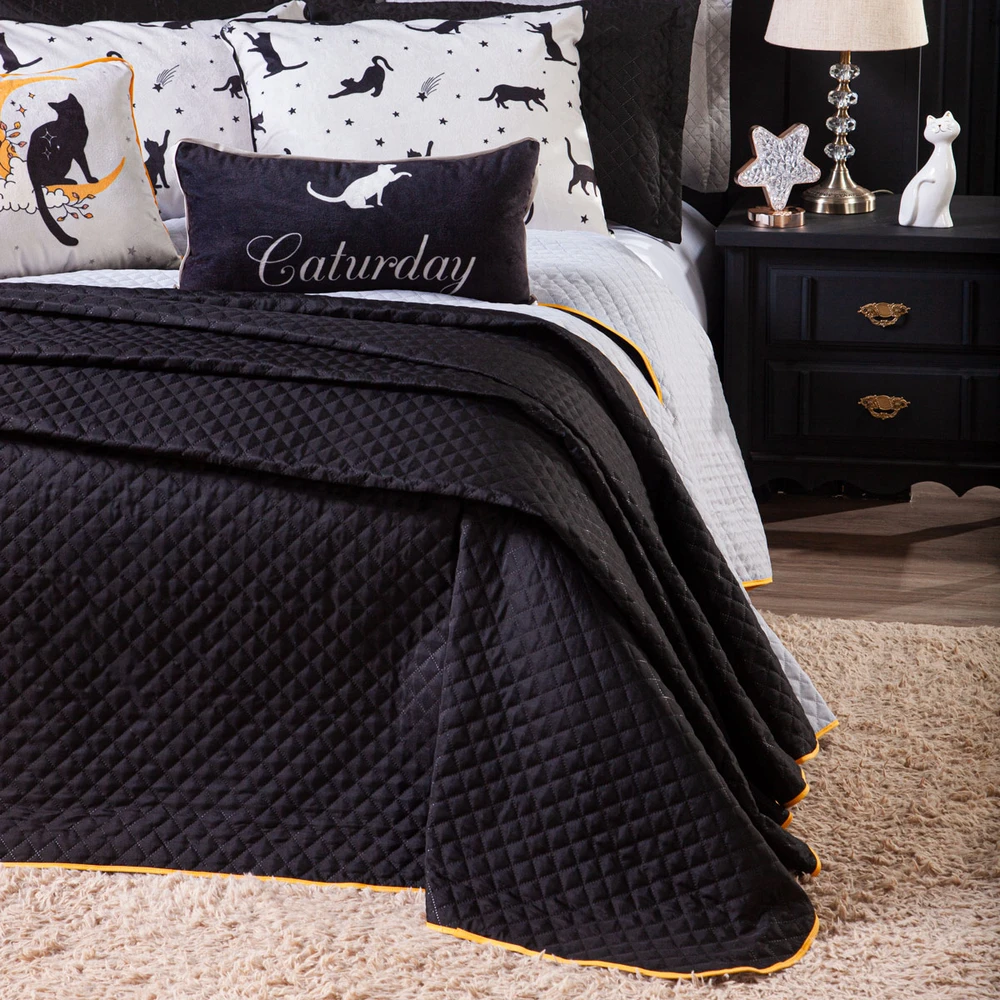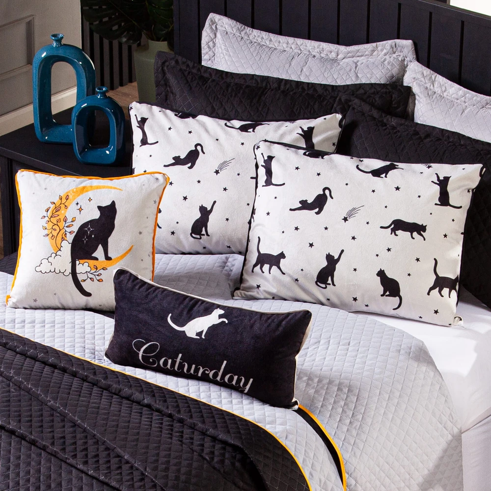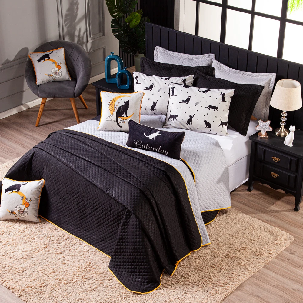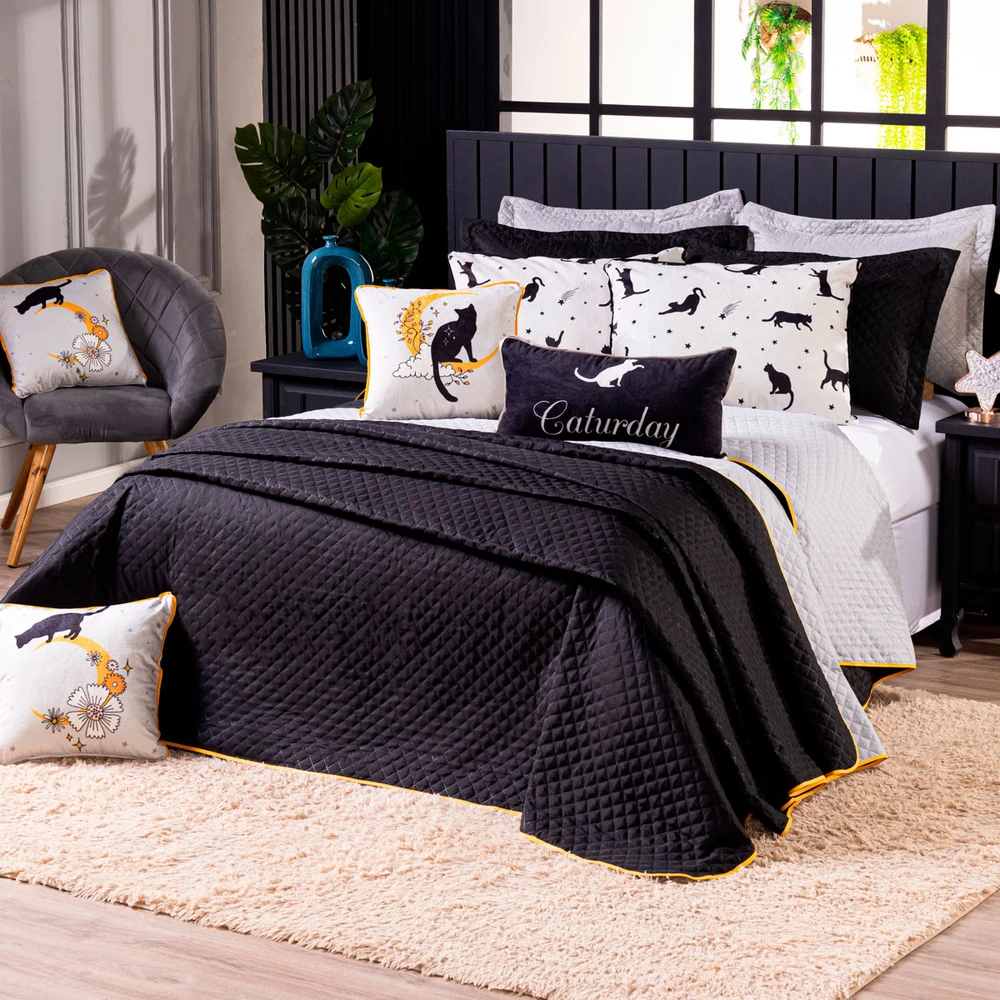 O Kit Cobre Leito Gatos é a escolha perfeita para quem busca um toque de charme e aconchego na decoração do quarto. Com um design encantador, que mistura a delicadeza dos gatinhos com o mistério das estrelas e da lua, esse conjunto traz um ar lúdico e acolhedor para o ambiente. O cobre leito em dupla face oferece versatilidade, permitindo que você escolha entre o lado preto e cinza, com um toque mais moderno, ideal para criar diferentes atmosferas no espaço. Acompanhado de almofadas decorativas e fronhas, as peças estampadas são confeccionadas em um veludo suede de alta qualidade, garantindo suavidade e conforto para suas noites de descanso. Seu tamanho é perfeito para camas de solteiro, proporcionando um ajuste perfeito e um visual harmonioso. Ideal para quem ama um toque de fofura aliado à sofisticação, o Kit Cobre Leito Gatos é uma excelente escolha para transformar seu quarto em um espaço acolhedor, com um estilo único e cheio de personalidade. Confira!