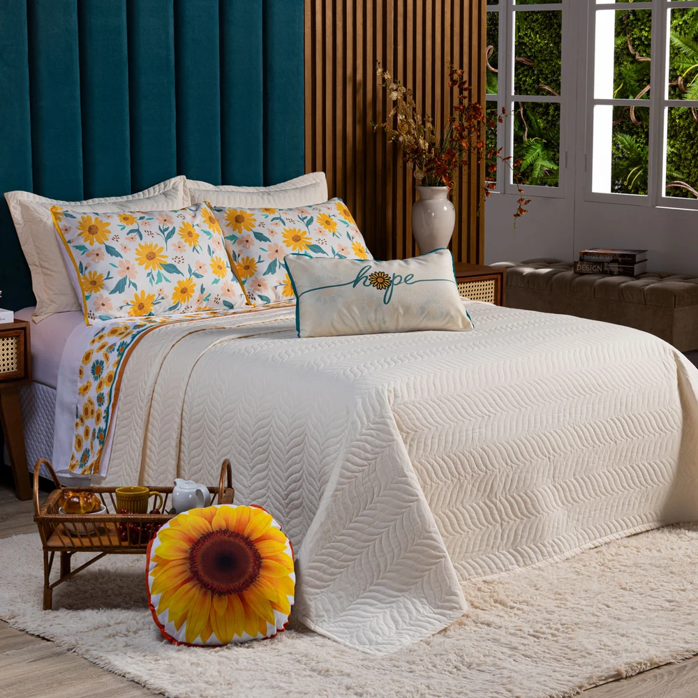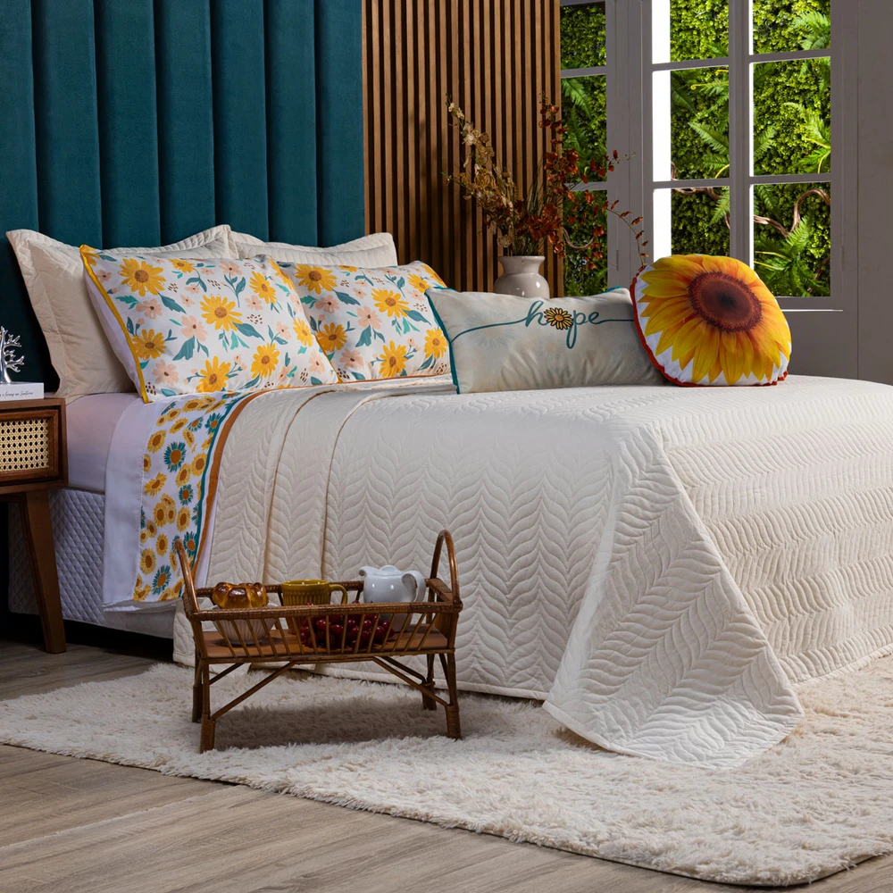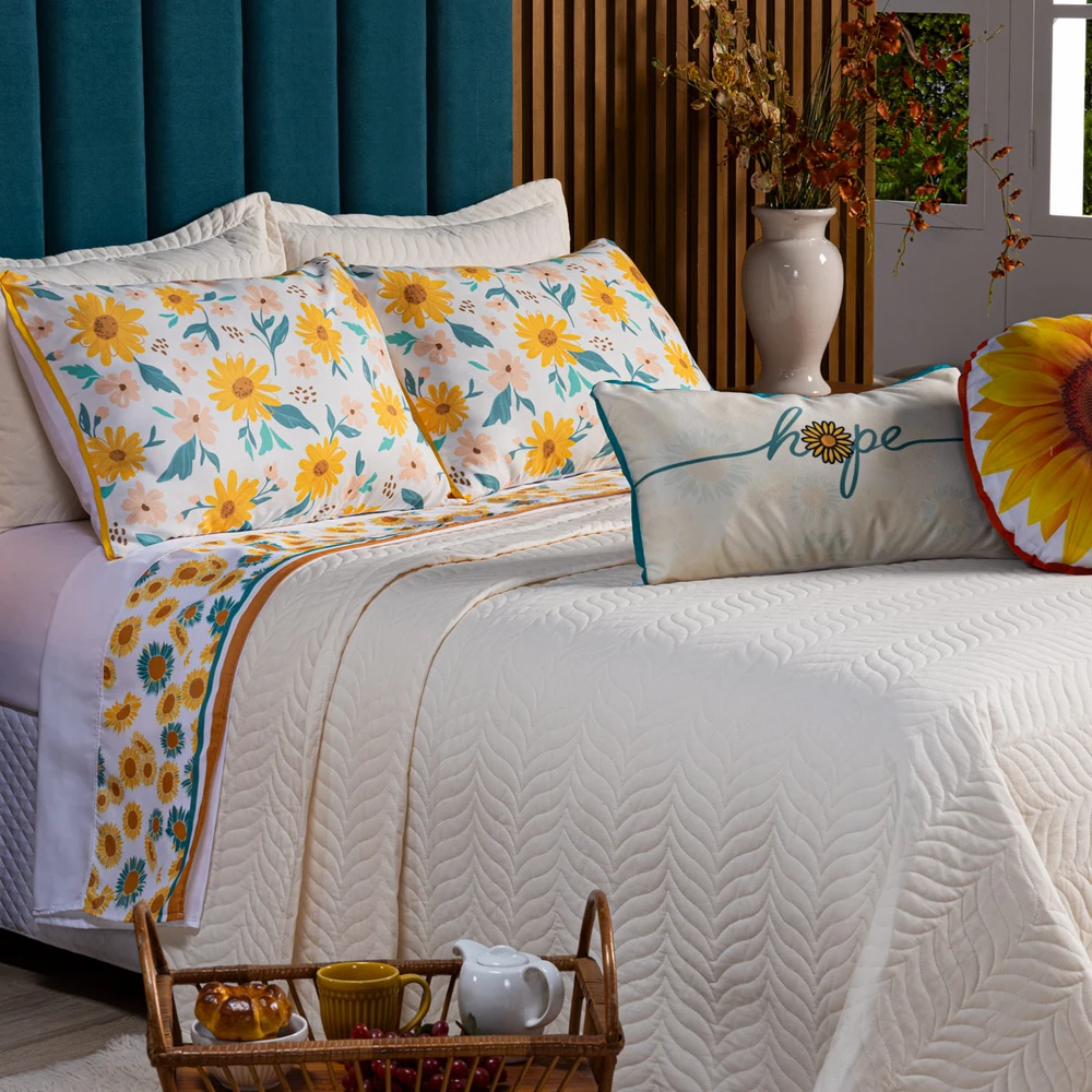 Confeccionado em tecido Percal 200 Fios de 100% Algodão, a nova Coleção Girassol vem trazendo um toque macio, com portas em acabamento debrum, o cobre leito com enchimento em manta dupla face, permitindo o uso dos dois lados, com lindos detalhes nos porta-travesseiros estampados temáticos com viés em toda a volta, tudo para combinar com a sua decoração! Acompanhando também uma linda almofada retangular e uma redonda de flor de girassol, todas com enchimento em silicone para trazer ainda mais conforto. Produzido num rigoroso controle de qualidade, dando um toque de requinte para o ambiente. Confira!