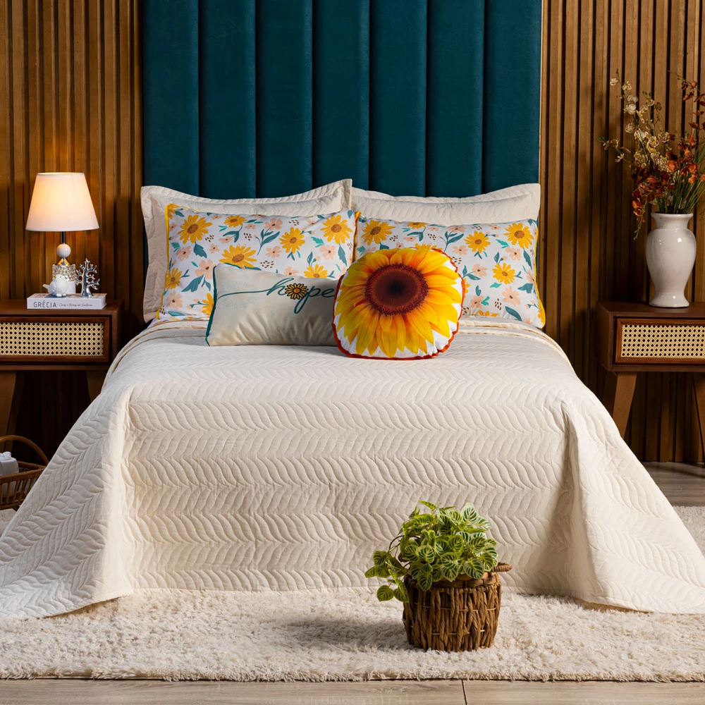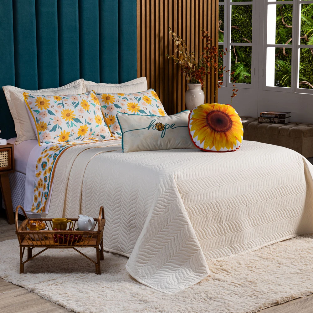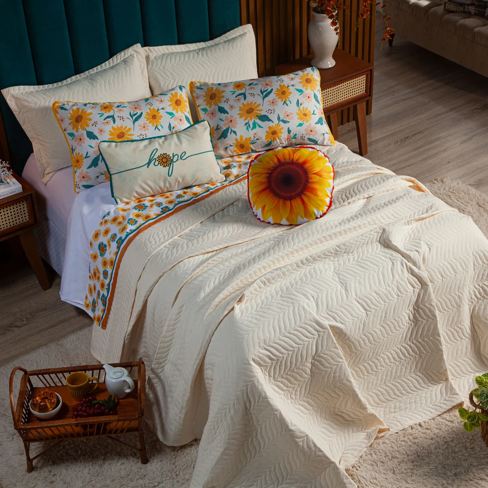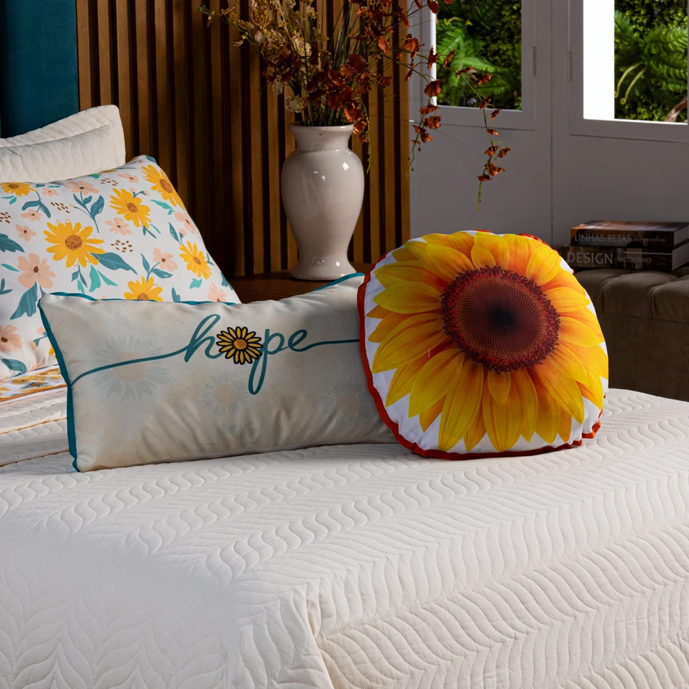 Confeccionado em tecido Percal 200 Fios de 100% Algodão, a nova Coleção Girassol vem trazendo um toque macio, com portas em acabamento debrum, o cobre leito com enchimento em manta dupla face, permitindo o uso dos dois lados, com lindos detalhes nos porta-travesseiros estampados temáticos com viés em toda a volta, tudo para combinar com a sua decoração! Acompanhando também uma linda almofada retangular e uma redonda de flor de girassol, todas com enchimento em silicone para trazer ainda mais conforto. Produzido num rigoroso controle de qualidade, dando um toque de requinte para o ambiente. Confira!