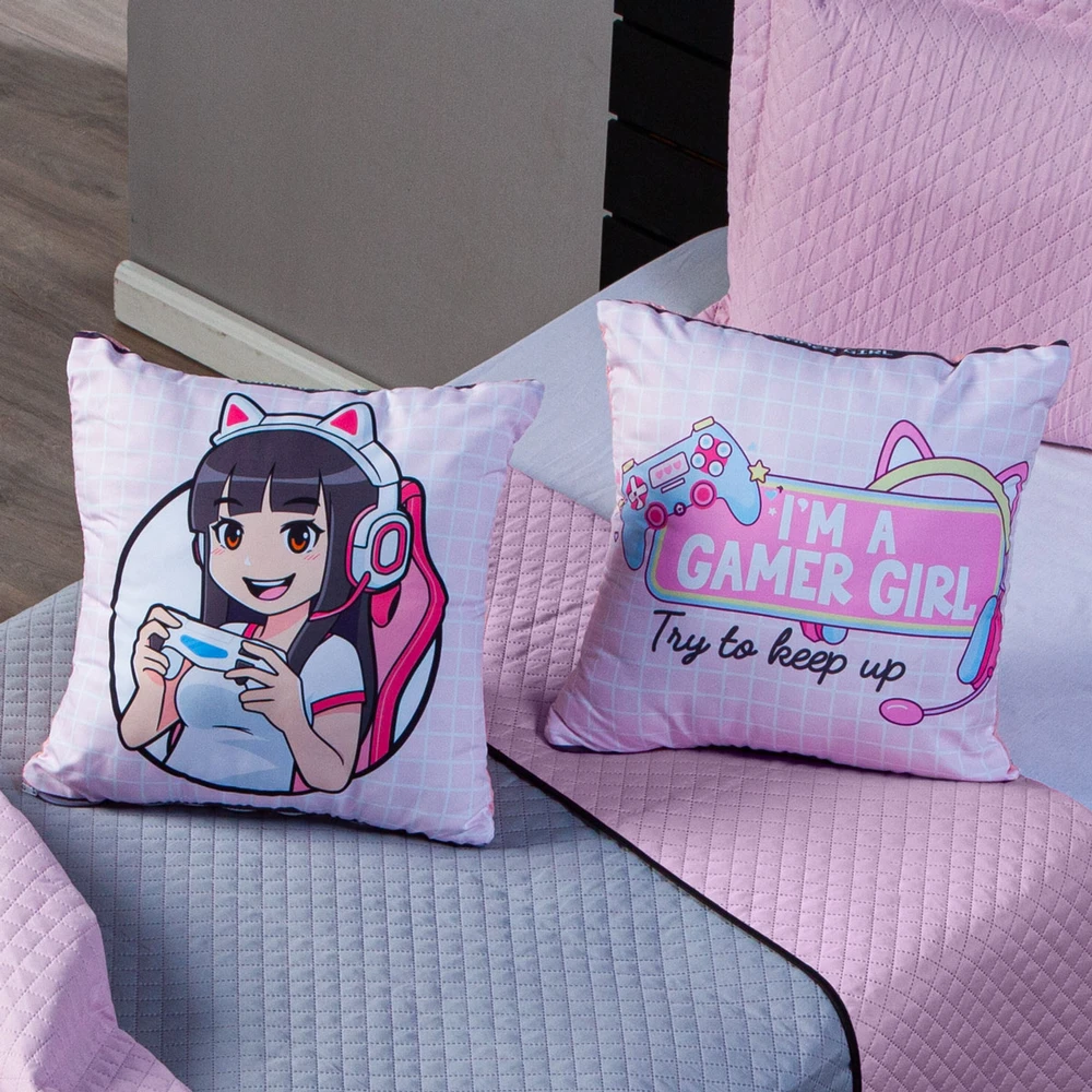 Confeccionado em tecido Microfibra Poliéster, a nova Coleção Girl Gamer vem trazendo um toque macio, com portas em acabamento debrum, o cobre leito com enchimento em manta dupla face, combinando cores modernas, permitindo o uso dos dois lados (Rosa e Cinza), tudo para combinar com a sua decoração! Acompanhando duas lindas capas de almofadas estampadas digitais com zíper, facilitando a lavagem e o seu dia a dia para montar a cama do seu jeito! Produzido num rigoroso controle de qualidade, dando um toque de requinte para o ambiente. Confira!