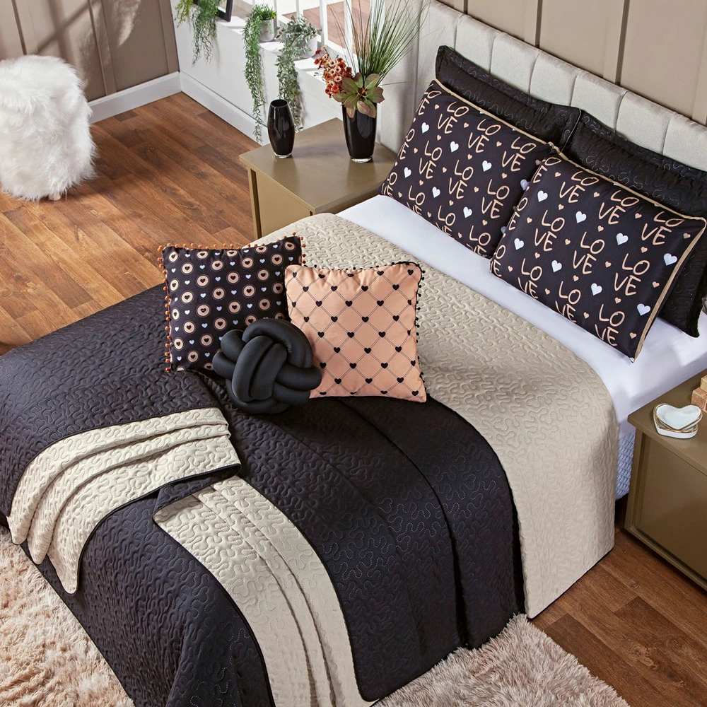 Confeccionado em tecido Microfibra 100% poliéster, a Coleção Golden Love vem trazendo um toque macio, com portas em acabamento debrum, o cobre leito com enchimento em manta dupla face, permitindo o uso dos dois lados (Preto e Caqui) com lindos detalhes nos porta-travesseiros e nas almofadinhas estampadas com Viés, tudo para combinar com a sua decoração! Produzido num rigoroso controle de qualidade, dando um toque de requinte para o ambiente. Confira!