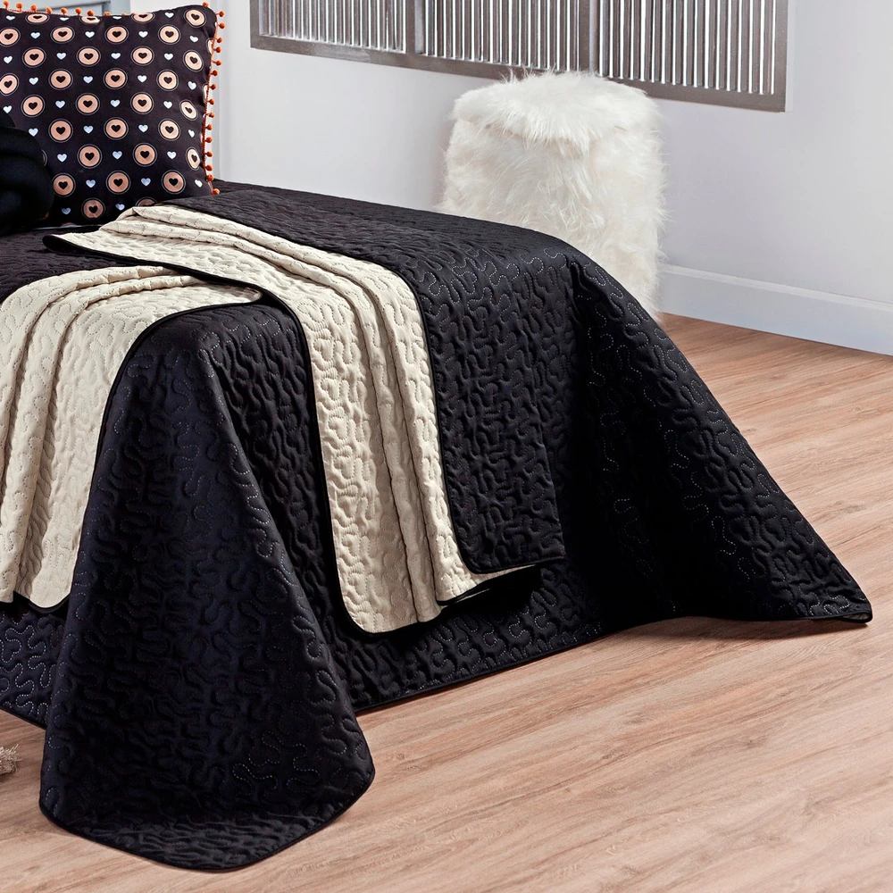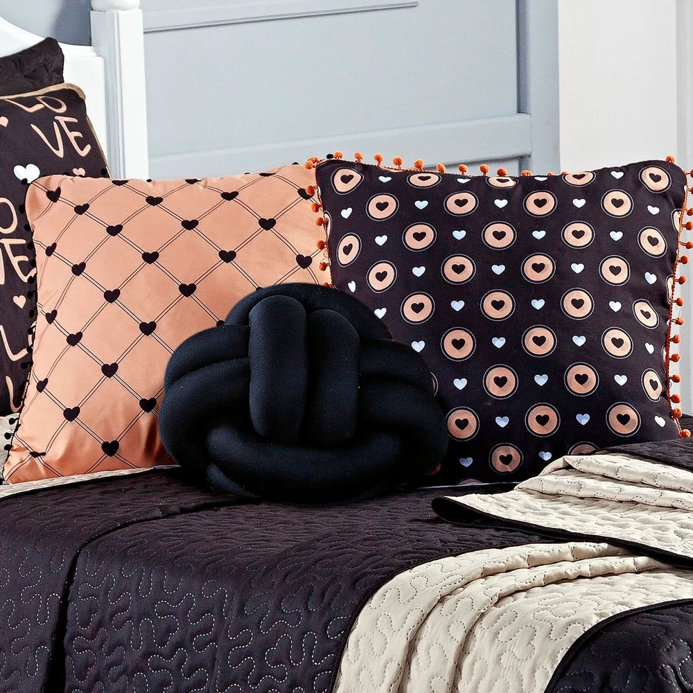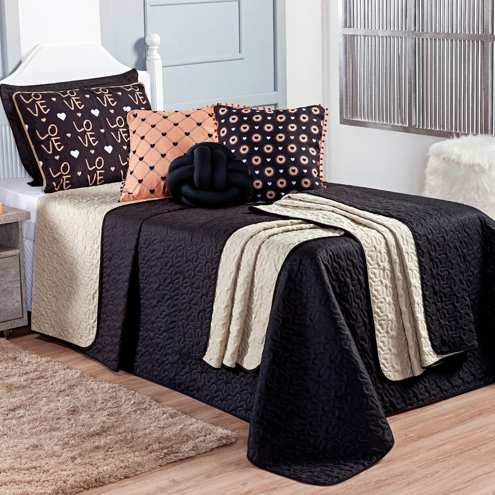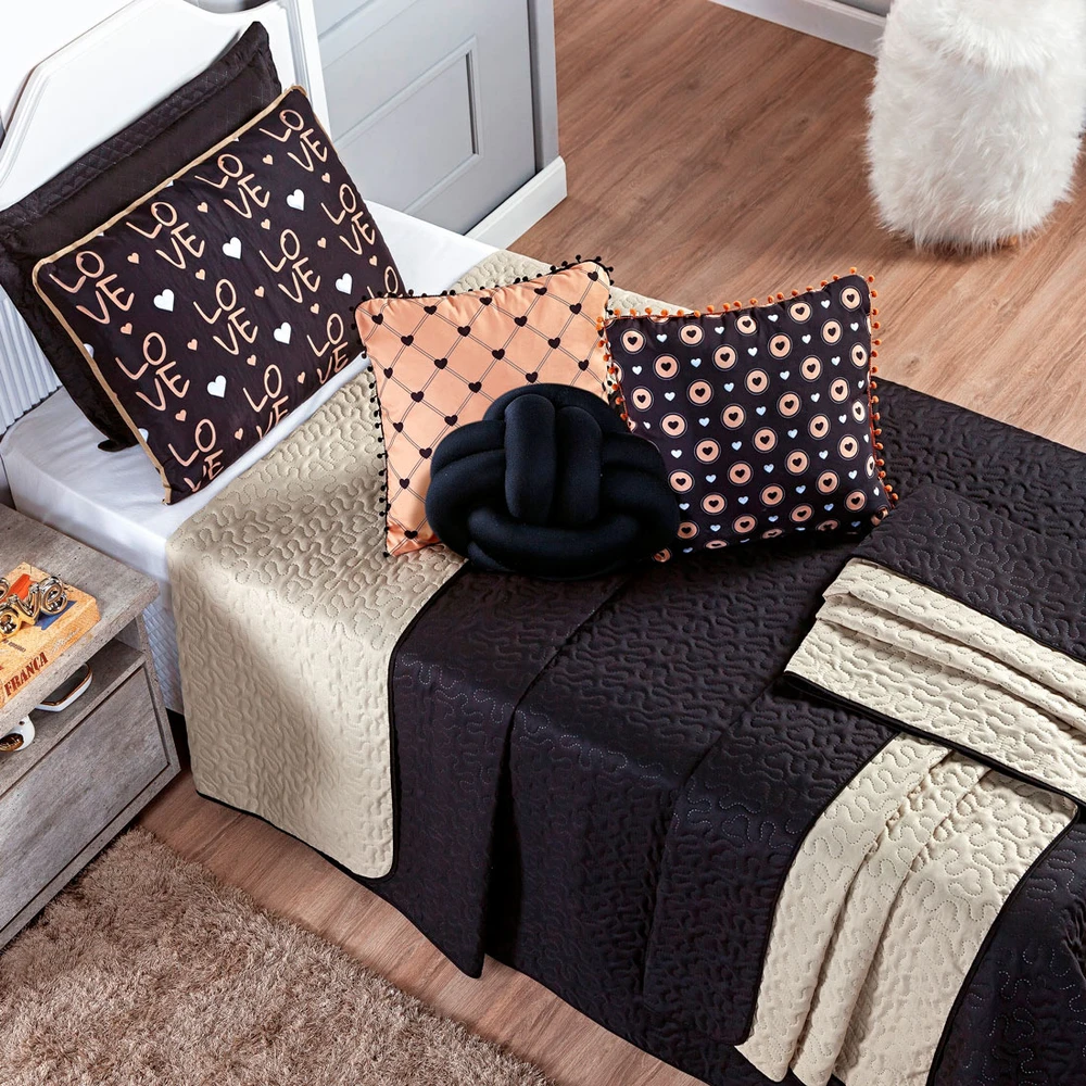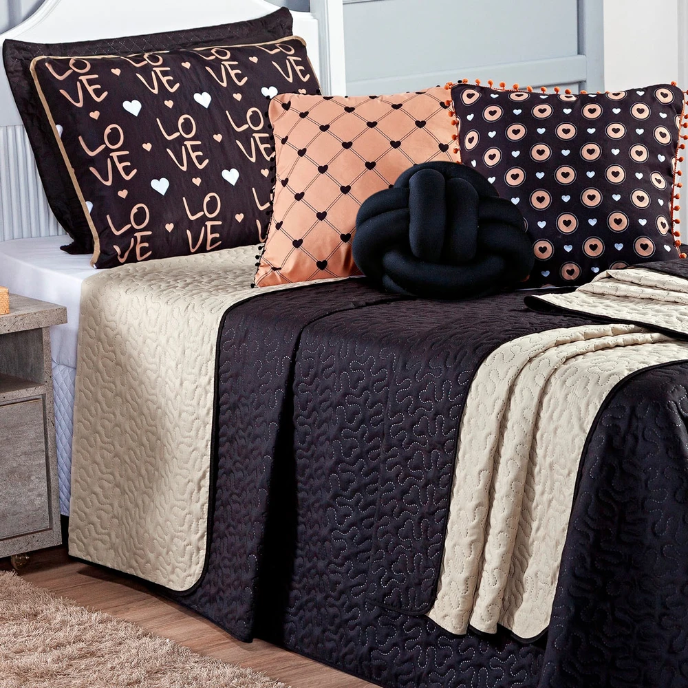 Confeccionado em tecido Microfibra 100% Políester, a nova Coleção Golden Love vem trazendo um toque macio, com portas em acabamento debrum, o cobre leito com enchimento em manta dupla face, permitindo o uso dos dois lados (Preto e Caqui) com lindos detalhes nos porta-travesseiros e nas almofadinhas estampadas com viés, tudo para combinar com a sua decoração! Produzido num rigoroso controle de qualidade, dando um toque de requinte para o ambiente. Confira!