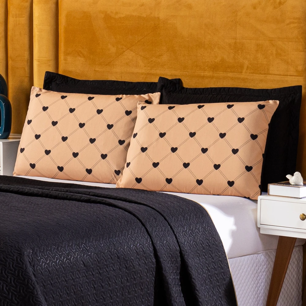 O Kit Cobre Leito Love Golden é a escolha ideal para adicionar um toque de sofisticação e elegância ao seu quarto. Este conjunto é dupla face, oferecendo versatilidade com um lado preto clássico e outro em caqui neutro, permitindo que você escolha o visual que mais combina com a sua decoração. O kit inclui duas fronhas estampadas e duas mateladas que complementam o design, acrescentando um toque de requinte ao conjunto. Projetado especificamente para camas de casal padrão, este conjunto é a maneira perfeita de transformar o seu quarto em um ambiente acolhedor com elementos de luxo. Ideal para casais que desejam uma decoração moderna e elegante que reflita seu amor e compromisso, com um toque dourado de romance. Confira!