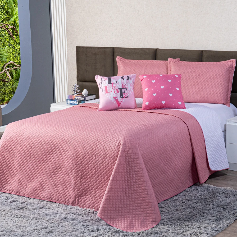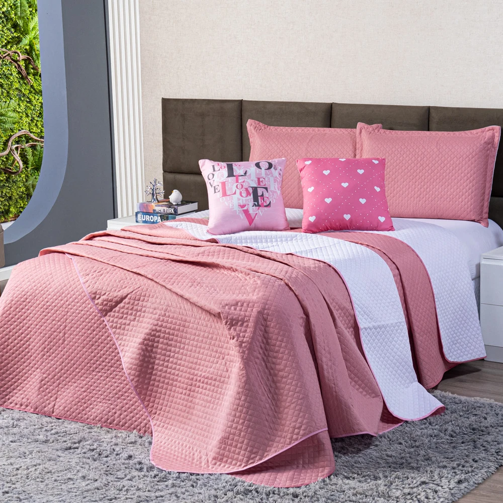 Confeccionado em tecido Microfibra Poliéster, a nova Coleção Love vem trazendo um toque macio, com portas em acabamento debrum, o cobre leito com enchimento em manta dupla face, combinando cores modernas, permitindo o uso dos dois lados (Rosê e Branco), tudo para combinar com a sua decoração! Acompanhando duas lindas capas de almofadas estampadas digitais com zíper, facilitando a lavagem e o seu dia a dia para montar a cama do seu jeito! Produzido num rigoroso controle de qualidade, dando um toque de requinte para o ambiente. Confira!