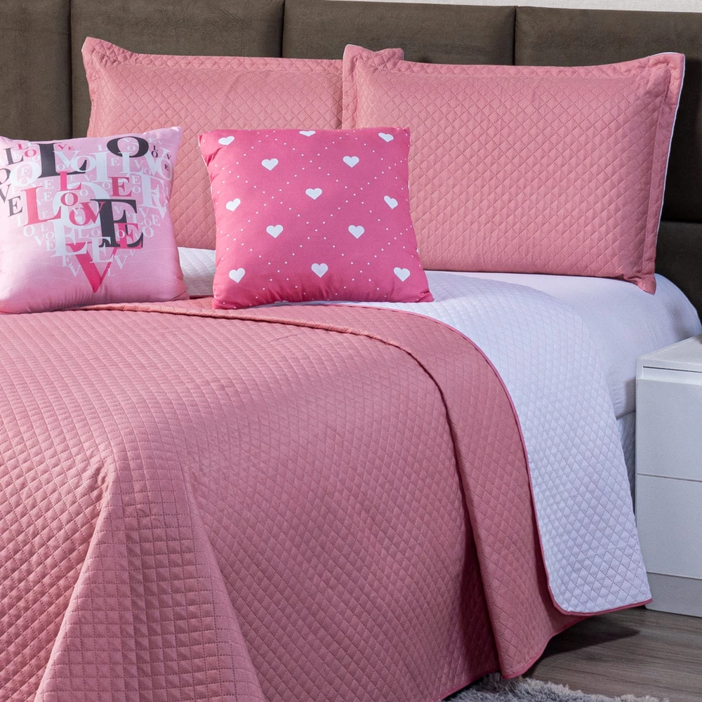 Confeccionado em tecido Microfibra Poliéster, a nova Coleção Love vem trazendo um toque macio, com portas em acabamento debrum, o cobre leito com enchimento em manta dupla face, combinando cores modernas, permitindo o uso dos dois lados (Rosê e Branco), tudo para combinar com a sua decoração! Acompanhando duas lindas capas de almofadas estampadas digitais com zíper, facilitando a lavagem e o seu dia a dia para montar a cama do seu jeito! Produzido num rigoroso controle de qualidade, dando um toque de requinte para o ambiente. Confira!