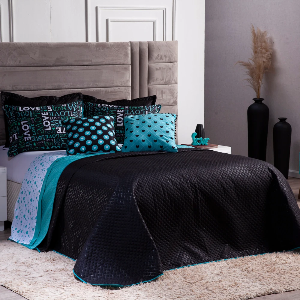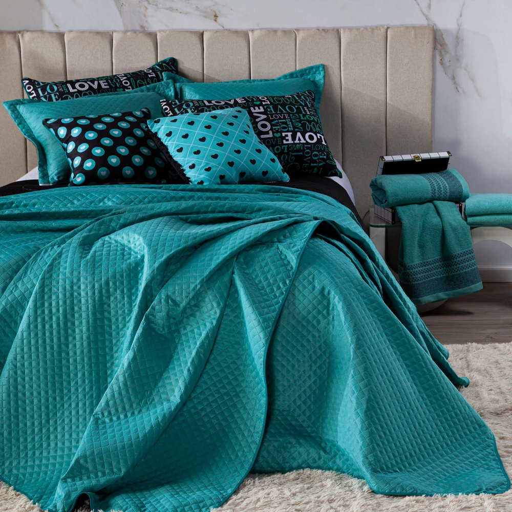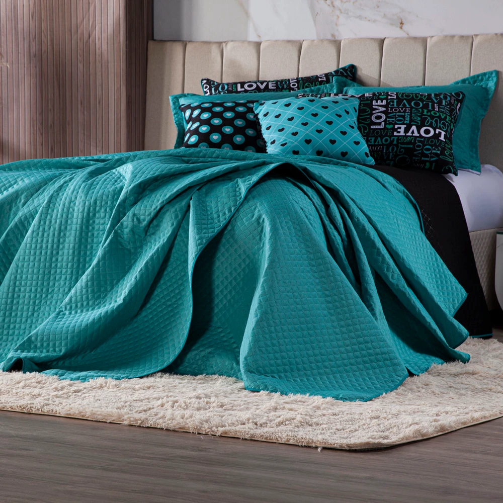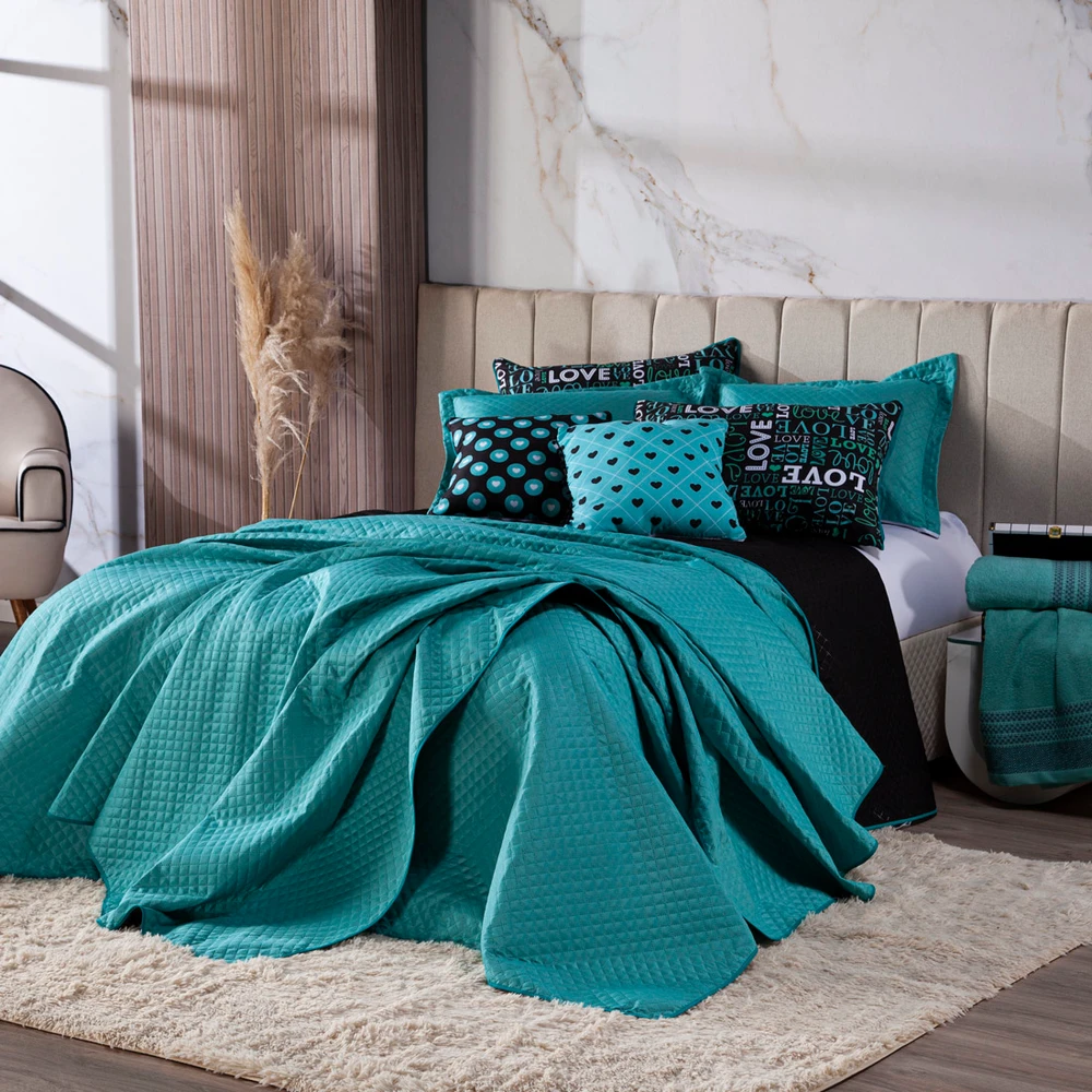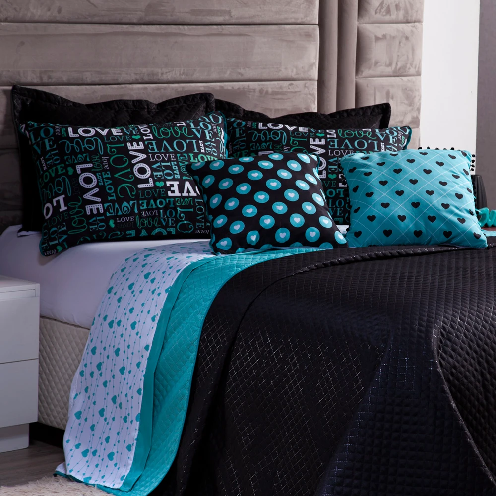 Confeccionado em tecido Microfibra 100% Políester, a nova Coleção Love Tiffany vem trazendo um toque macio, com portas em acabamento debrum, o cobre leito com enchimento em manta dupla face, permitindo o uso dos dois lados (Tiffany e Preto) com lindos detalhes nos porta-travesseiros matelados e também nas almofadinhas estampadas com pompom e viés, tudo para combinar com a sua decoração! Produzido num rigoroso controle de qualidade, dando um toque de requinte para o ambiente. Confira!