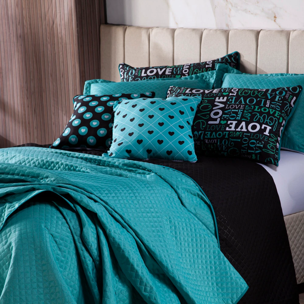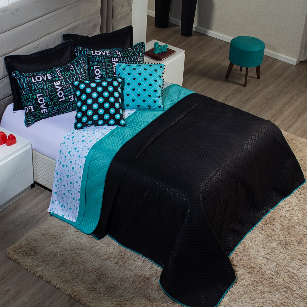 Confeccionado em tecido Microfibra 100% Políester, a nova Coleção Love Tiffany vem trazendo um toque macio, com portas em acabamento debrum, o cobre leito com enchimento em manta dupla face, permitindo o uso dos dois lados (Tiffany e Preto) com lindos detalhes nos porta-travesseiros matelados e também nas almofadinhas estampadas com pompom e viés, tudo para combinar com a sua decoração! Produzido num rigoroso controle de qualidade, dando um toque de requinte para o ambiente. Confira!