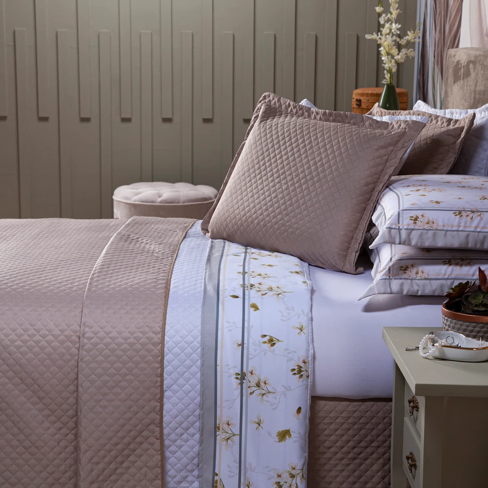 Confeccionado em tecido Microfibra 100% poliéster, a nova Coleção Maya vem trazendo um toque macio, com portas travesseiros matelados em acabamento debrum, o cobre leito com enchimento em manta dupla face, permitindo o uso dos dois lados (Caqui e Branco) com lindos detalhes nas fronhas estampadas e na vira de lençol em floral, tudo para combinar com a sua decoração! Produzido num rigoroso controle de qualidade, dando um toque de requinte para o ambiente. Confira!