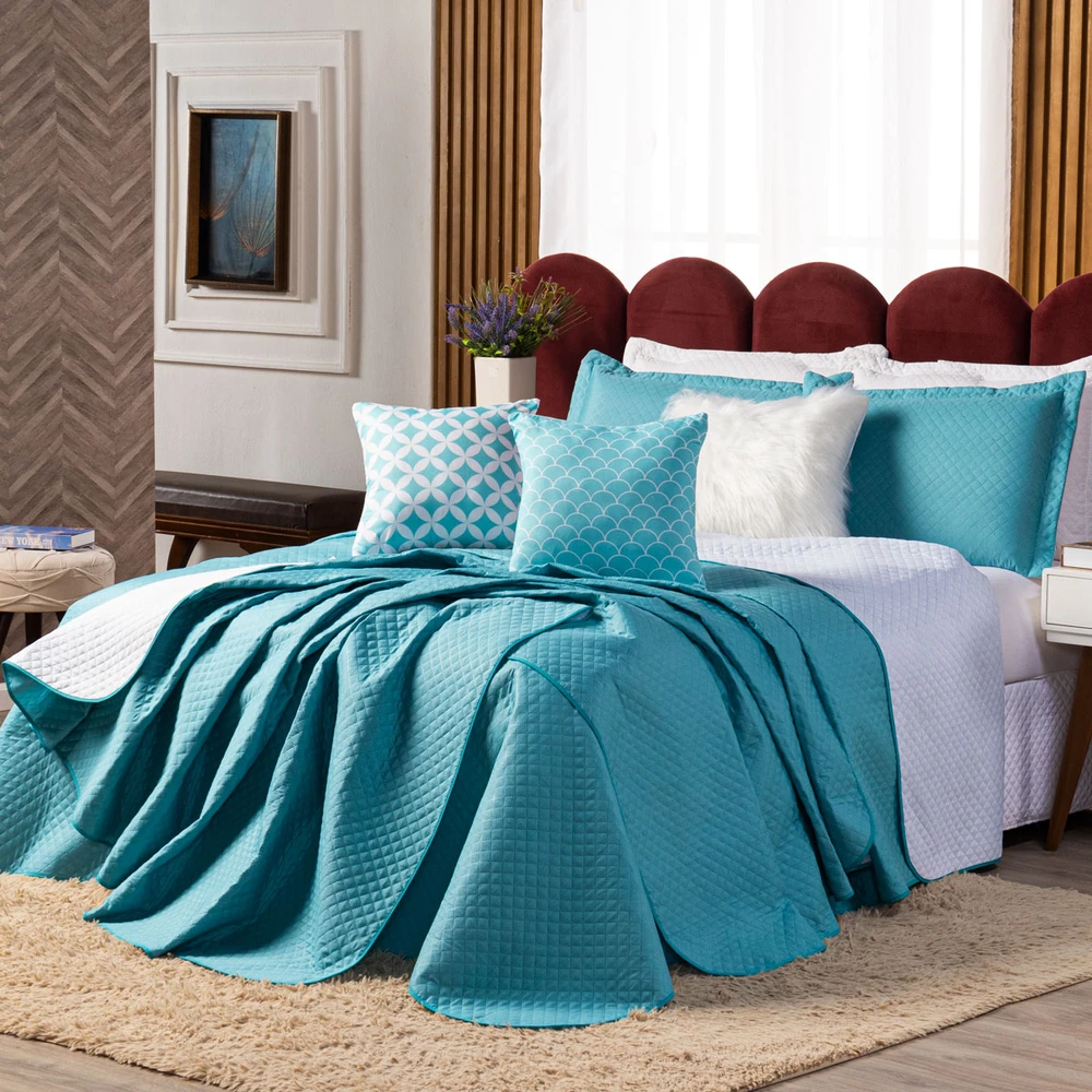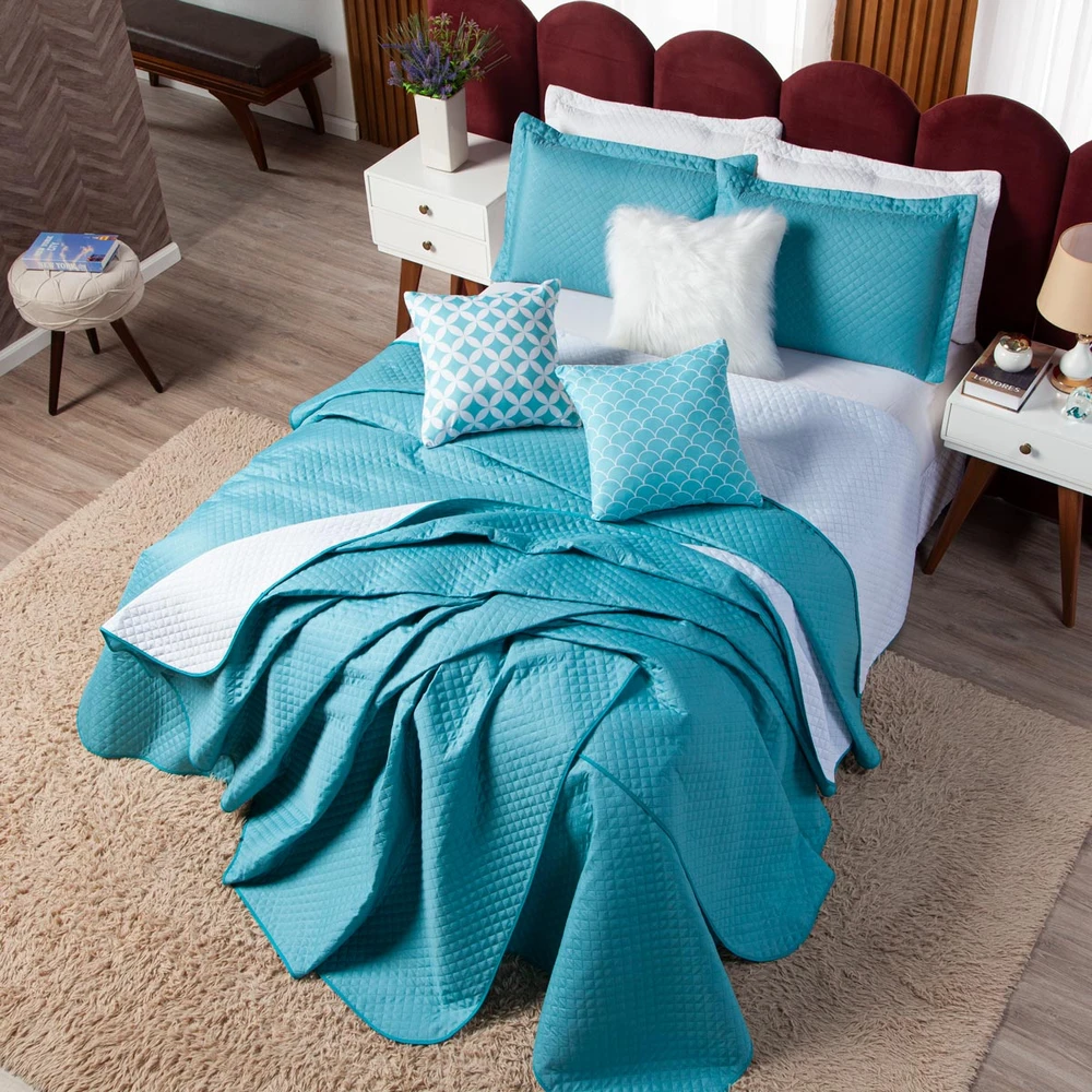 Confeccionado em tecido Microfibra 100% poliéster, a nova Coleção Miami vem trazendo um toque macio, com portas em acabamento debrum, o cobre leito com enchimento em manta dupla face, permitindo o uso dos dois lados (Verde Tiffany e Branco) com lindos detalhes nas capinhas de almofadas estampadas e na almofadinha de Plush! Tudo para combinar com a sua decoração! Produzido num rigoroso controle de qualidade, dando um toque de requinte para o ambiente. Confira!