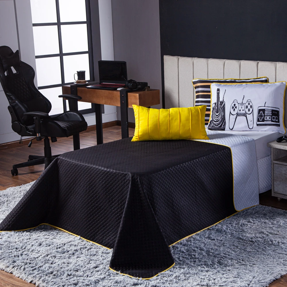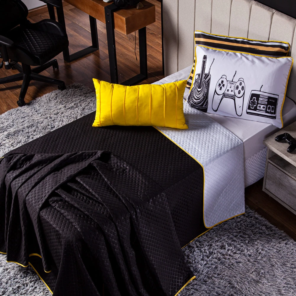 Confira nossa nova Coleção Old Game, pensando especialmente na beleza do seu quarto, lançamos em apenas um kit tudo que sua cama precisa para tornar seu ambiente ainda mais lindo e super decorado. Para a praticidade do seu dia-a-dia o Cobre Leito é confeccionado em tecido Microfibra 100% Poliéster, trazendo um toque macio, com portas estampados em acabamento debrum, o cobre leito com enchimento em manta dupla face, permitindo o uso dos dois lados (Preto e Branco) com lindos detalhes nos porta-travesseiros estampados e na almofadinha retangular, completando o charme na sua cama, tudo perfeito para combinar com a sua decoração! Produzido num rigoroso controle de qualidade, dando um toque de requinte para o ambiente.