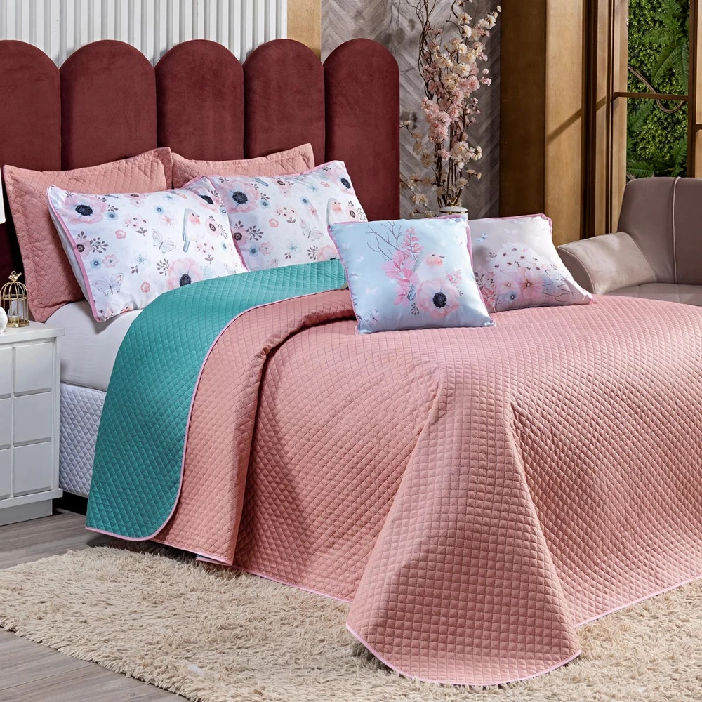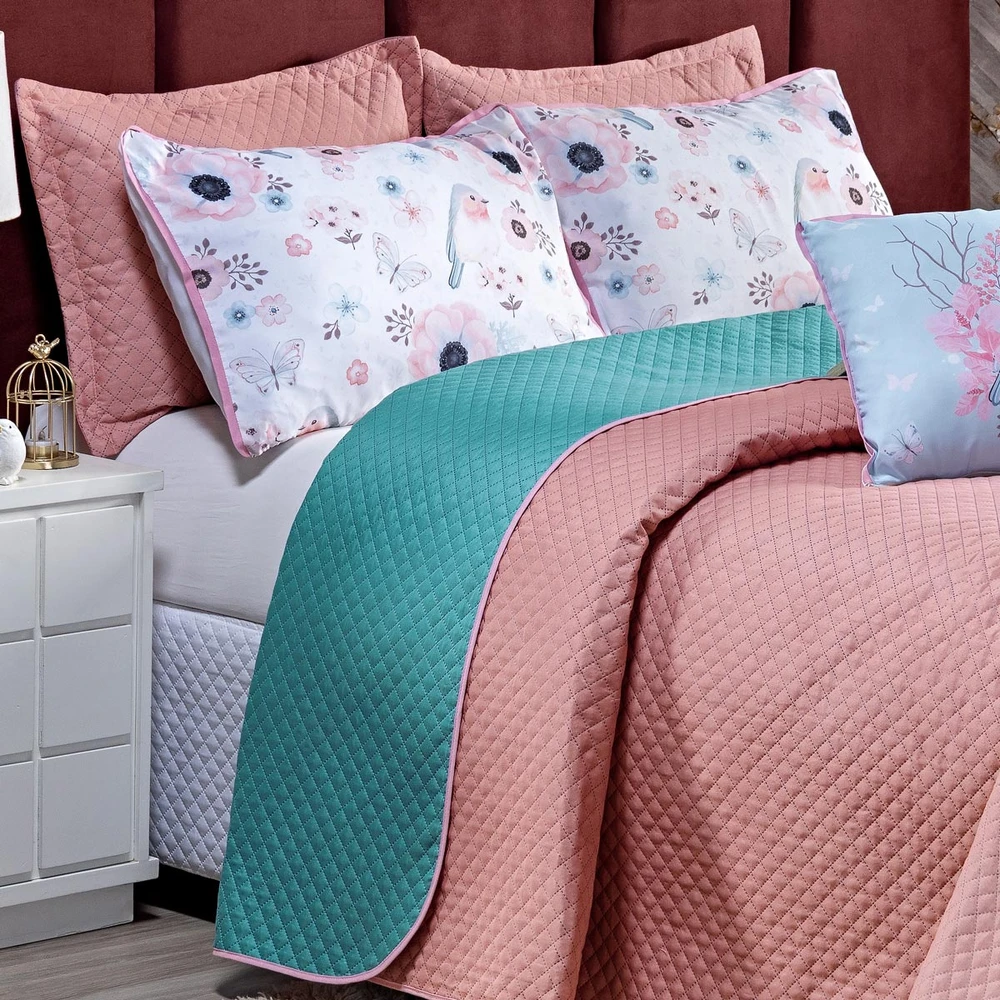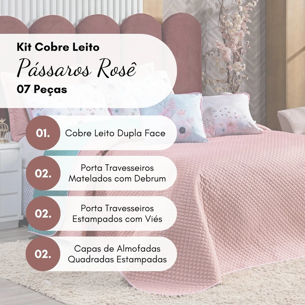 Apresentamos o encantador Kit Cobre Leito Pássaros, uma adição deslumbrante para transformar o seu quarto em um santuário de serenidade e estilo. Composto por sete peças meticulosamente selecionadas, este conjunto oferece uma fusão perfeita de elegância e conforto. O cobre leito, confeccionado em tecido de qualidade, proporciona durabilidade excepcional e uma sensação suave ao toque, enquanto sua versatilidade dupla face permite alternar entre os tons suaves de rosê e o vibrante verde tiffany, permitindo a personalização de acordo com seu gosto e estilo. As capas de almofadas inclusas complementam o conjunto, acrescentando um toque final de sofisticação e conforto com traços e desenhos de aves e flores em cores suaves. Ideal para quem busca criar um ambiente acolhedor e elegante. Renove seu espaço com este kit e desfrute de noites de sono tranquilas e cheias de estilo. Confira!