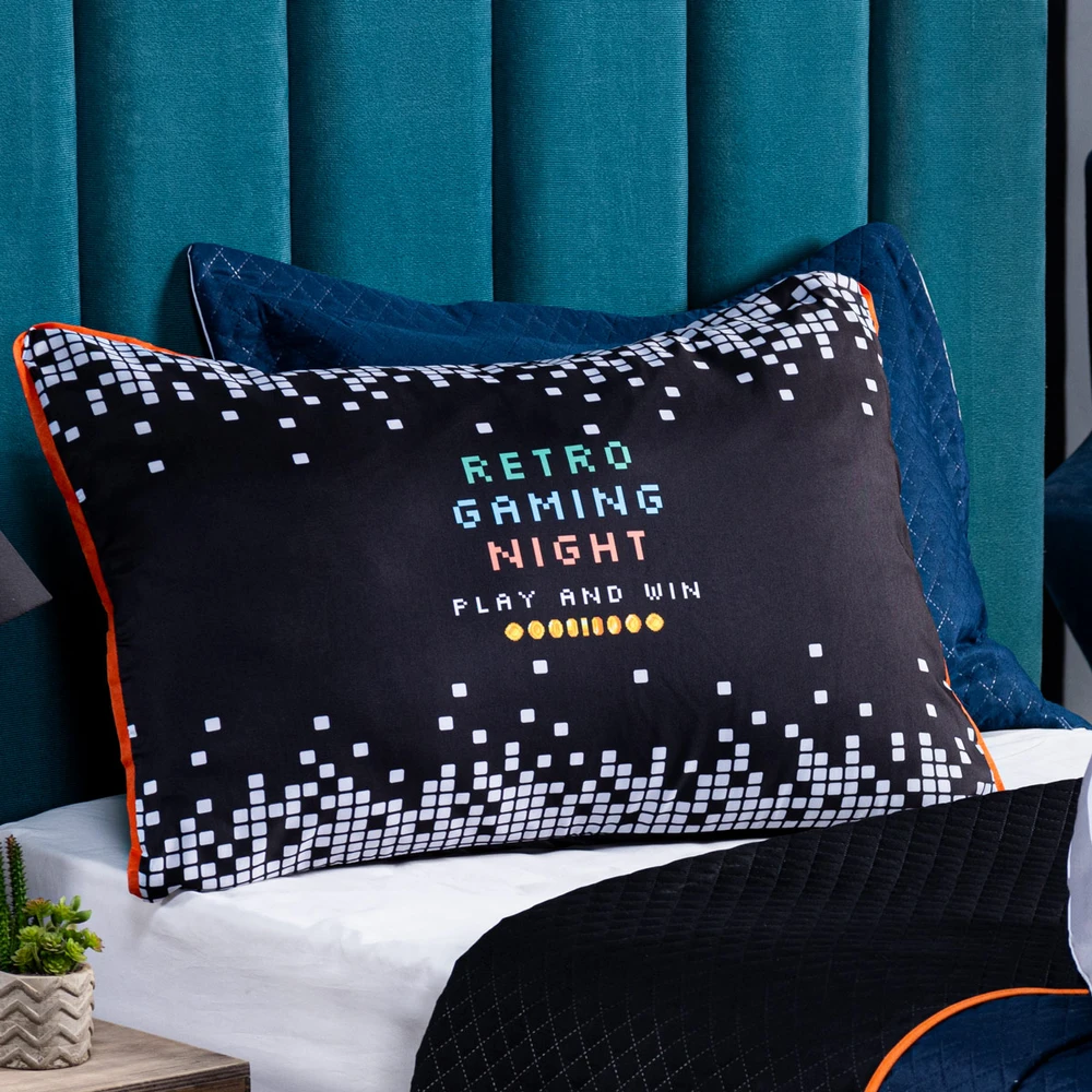 Confeccionado em tecido Microfibra Poliéster, a nova Coleção Retro Game vem trazendo um toque macio, com portas em acabamento debrum, o cobre leito com enchimento em manta dupla face, permitindo o uso dos dois lados (Azul Marinho e Preto), com lindos detalhes nos porta-travesseiros estampados com viés em toda a volta, tudo para combinar com a sua decoração Gamer! Acompanhando também duas lindas almofadas em formato de controles de videogames antigos para sentir aquela nostalgia ao entrar no quarto, todas estampadas digital e com enchimento em silicone. Produzido num rigoroso controle de qualidade, dando um toque de requinte para o ambiente. Confira!