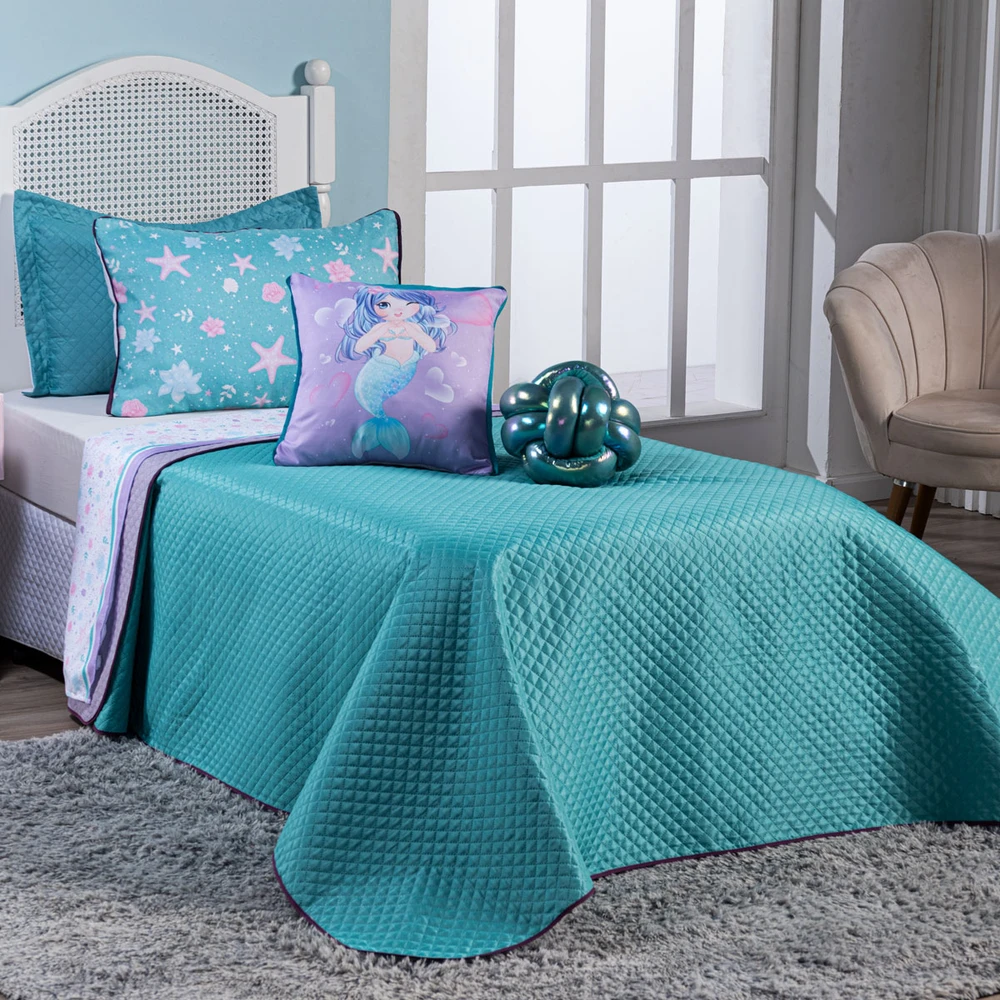 Confeccionado em tecido Microfibra Poliéster, a nova Coleção Sereia Tiffany vem trazendo um toque macio, com portas em acabamento debrum, o cobre leito com enchimento em manta dupla face, permitindo o uso dos dois lados (Tiffany e Lilás), tudo para combinar com a sua decoração! Acompanhando uma linda almofada de nó em malha furtacor com enchimento silicone e também uma capinha de almofada quadrada estampada digital com zíper. E para completar sua decoração, desenvolvemos os porta-travesseiros estampados em dupla face, podendo utilizar tanto o lado estampado Tiffany quanto o lado estampado Lilás, para montar a cama do seu jeito! Produzido num rigoroso controle de qualidade, dando um toque de requinte para o ambiente. Confira!