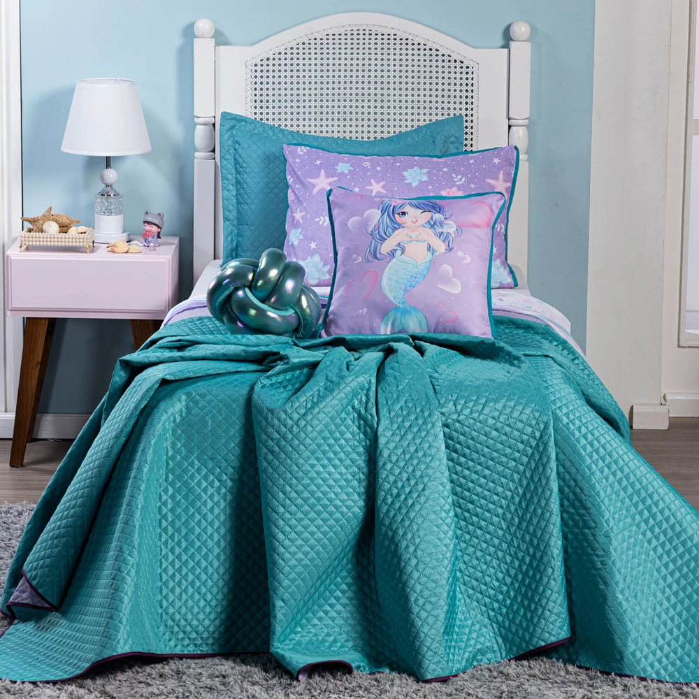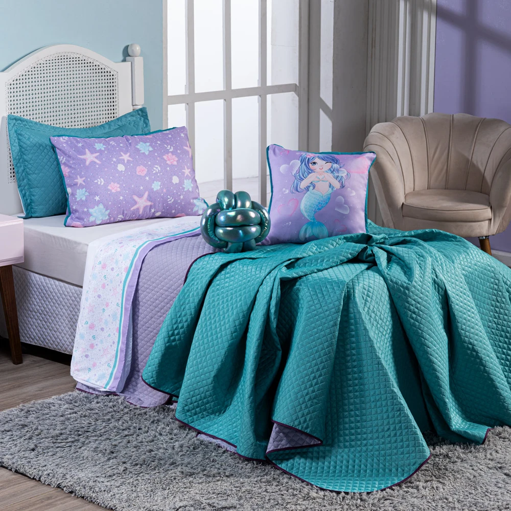Confeccionado em tecido Microfibra Poliéster, a nova Coleção Sereia Tiffany vem trazendo um toque macio, com porta em acabamento debrum, o cobre leito com enchimento em manta dupla face, permitindo o uso dos dois lados (Tiffany e Lilás), tudo para combinar com a sua decoração! Acompanhando uma linda almofada de nó em malha furtacor com enchimento silicone e também uma capinha de almofada quadrada estampada digital com zíper. E para completar sua decoração, desenvolvemos o porta-travesseiro estampado em dupla face, podendo utilizar tanto o lado estampado Tiffany quanto o lado estampado Lilás, para montar a cama do seu jeito! Produzido num rigoroso controle de qualidade, dando um toque de requinte para o ambiente. Confira!