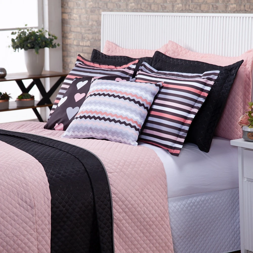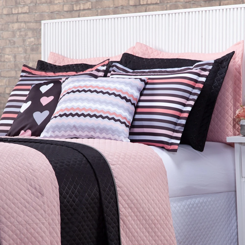 Confeccionado em tecido Microfibra 100% Poliéster, a nova Coleção Sophia vem trazendo um toque macio, com portas em acabamento debrum, o cobre leito com enchimento em manta dupla face, permitindo o uso dos dois lados (preto e salmão) com lindos detalhes nos porta-travesseiros listrados e nas duas almofadinhas estampadas em chevron e corações, tudo para combinar com a sua decoração! Produzido num rigoroso controle de qualidade, dando um toque de requinte para o ambiente. Confira!