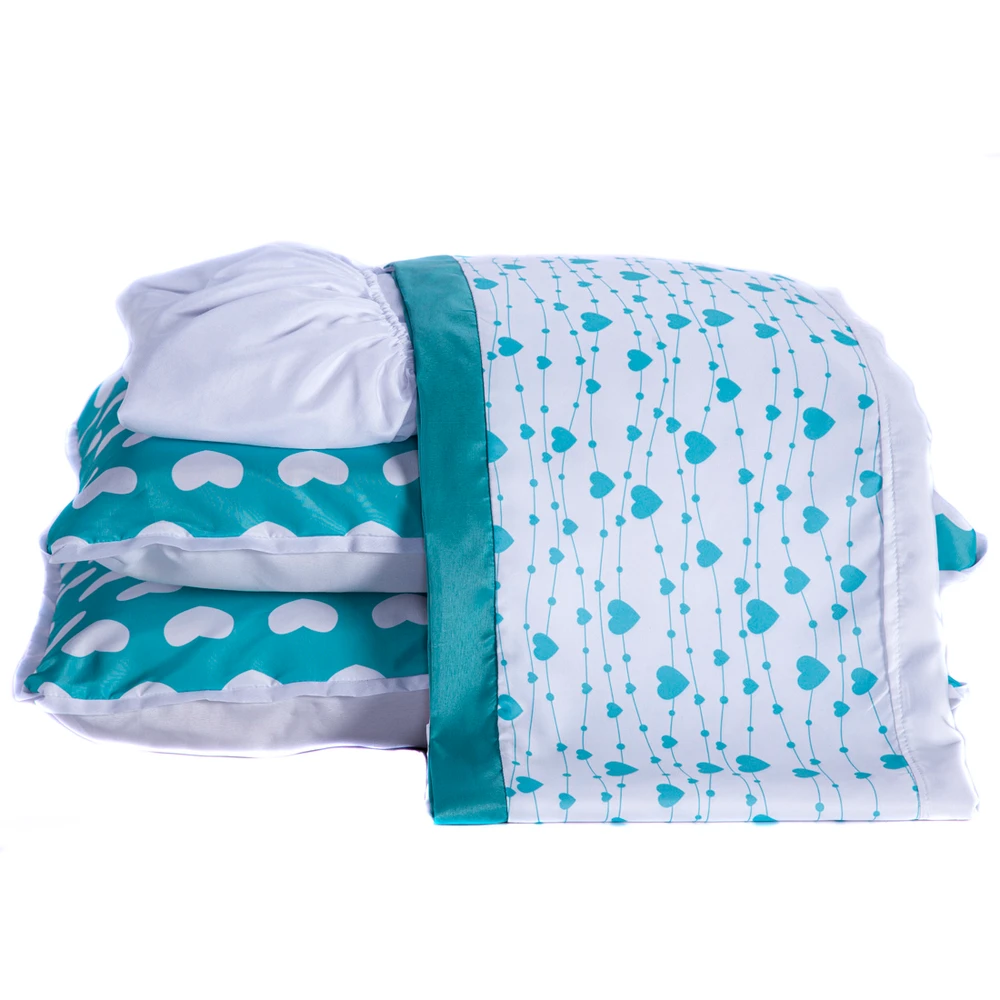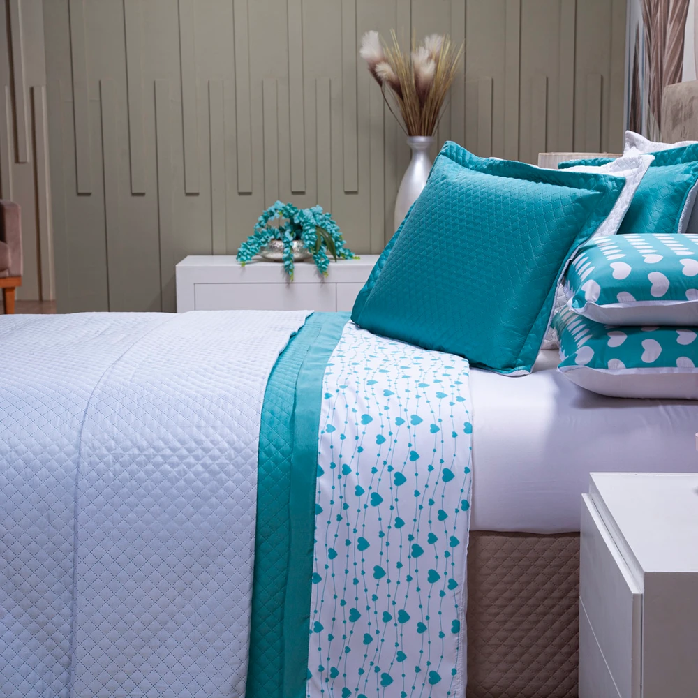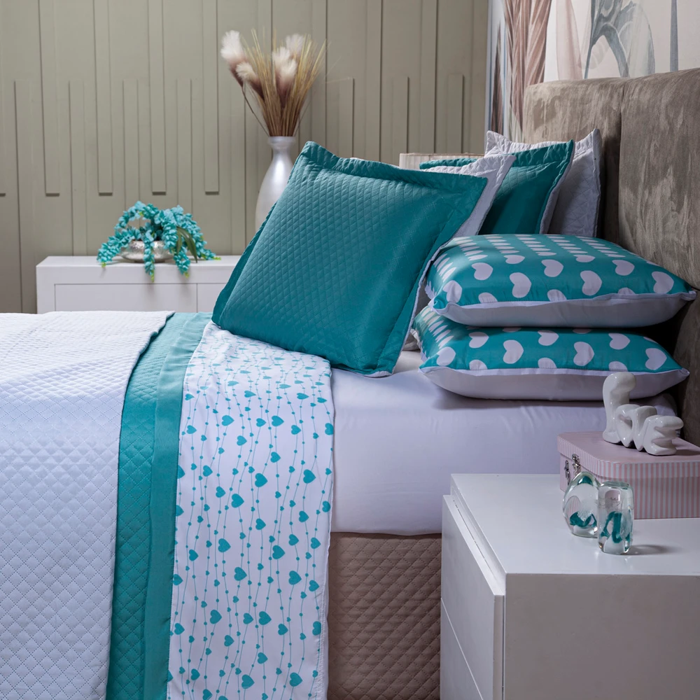 Confeccionado em tecido Microfibra 100% poliéster, a nova Coleção Vênus vem trazendo um toque macio, com portas travesseiros matelados em acabamento debrum, o cobre leito com enchimento em manta dupla face, permitindo o uso dos dois lados (Branco e Tiffany). Com lindos detalhes nas fronhas estampadas e na vira de lençol em corações, tudo para combinar com a sua decoração! Produzido num rigoroso controle de qualidade, dando um toque de requinte para o ambiente. Confira!
