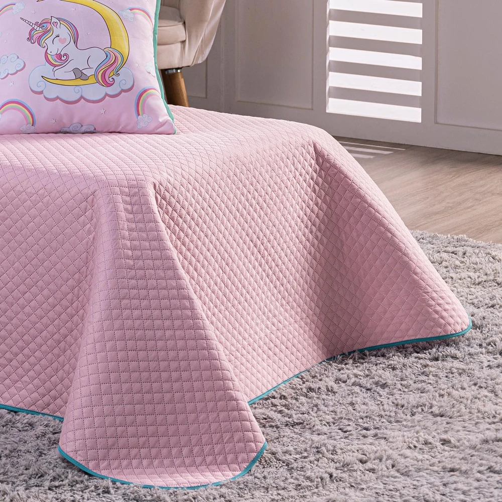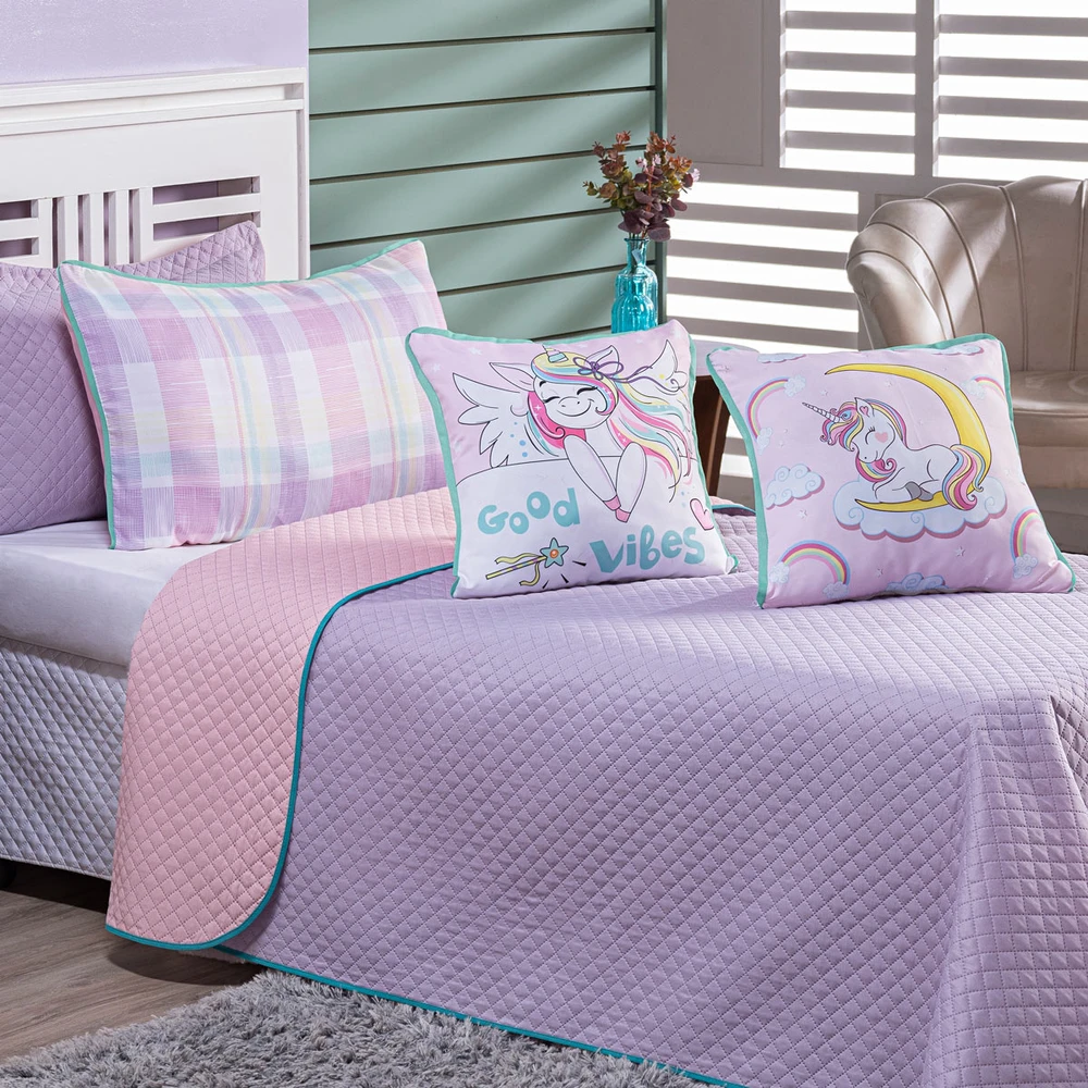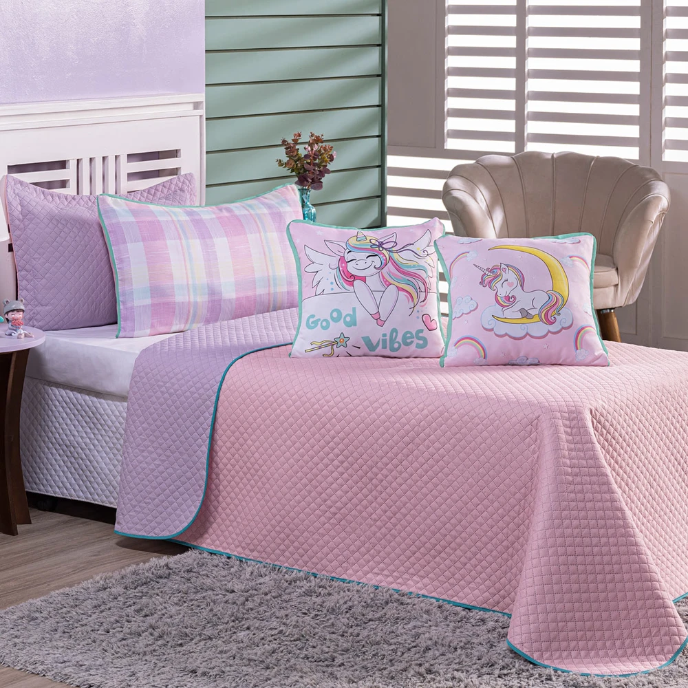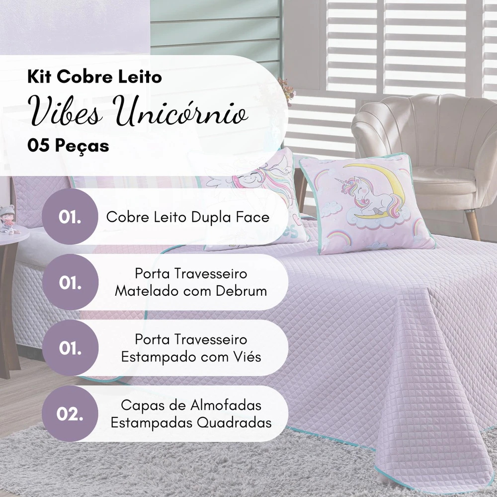 Explore a magia com o nosso encantador Kit Cobre Leito Vibes Unicórnio. Este conjunto de cinco peças é perfeito para adicionar um toque de fantasia e cor ao seu quarto. Com uma dupla face, você pode escolher entre os tons suaves de lilás ou os vibrantes tons de rosa para combinar com o seu humor e estilo. As capas de almofadas inclusas proporcionam um conforto extra e completam o visual mágico deste conjunto, estampadas com lindos e mágicos elementos temáticos de Unicórnios. Ideal para quem busca criar um ambiente encantado e cheio de personalidade. Deixe-se levar pela energia positiva e pela atmosfera dos unicórnios com este kit. Confira!