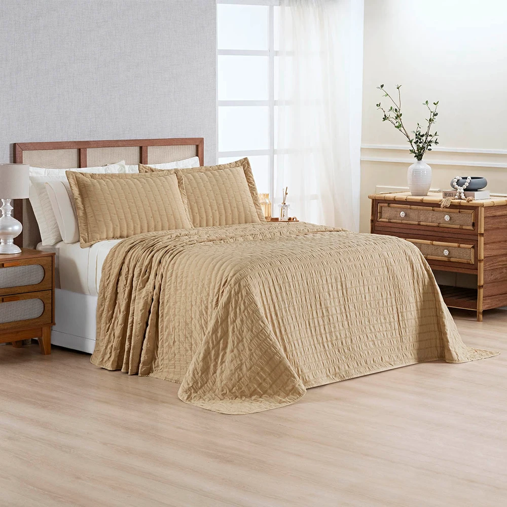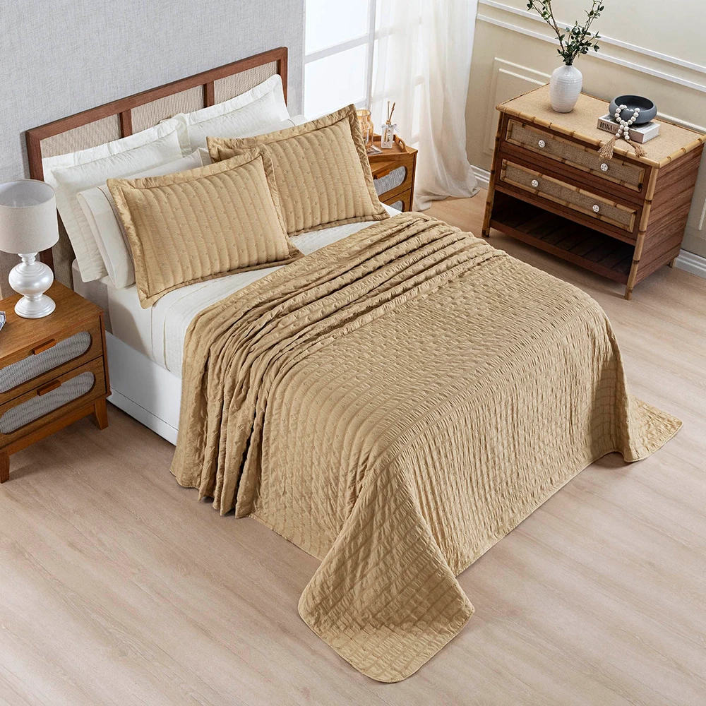 Kit Colcha Cobre Leito Plissê Casal Seersucker Premium 3 Peças Maciez e Leveza com Textura 3D Bege Mel