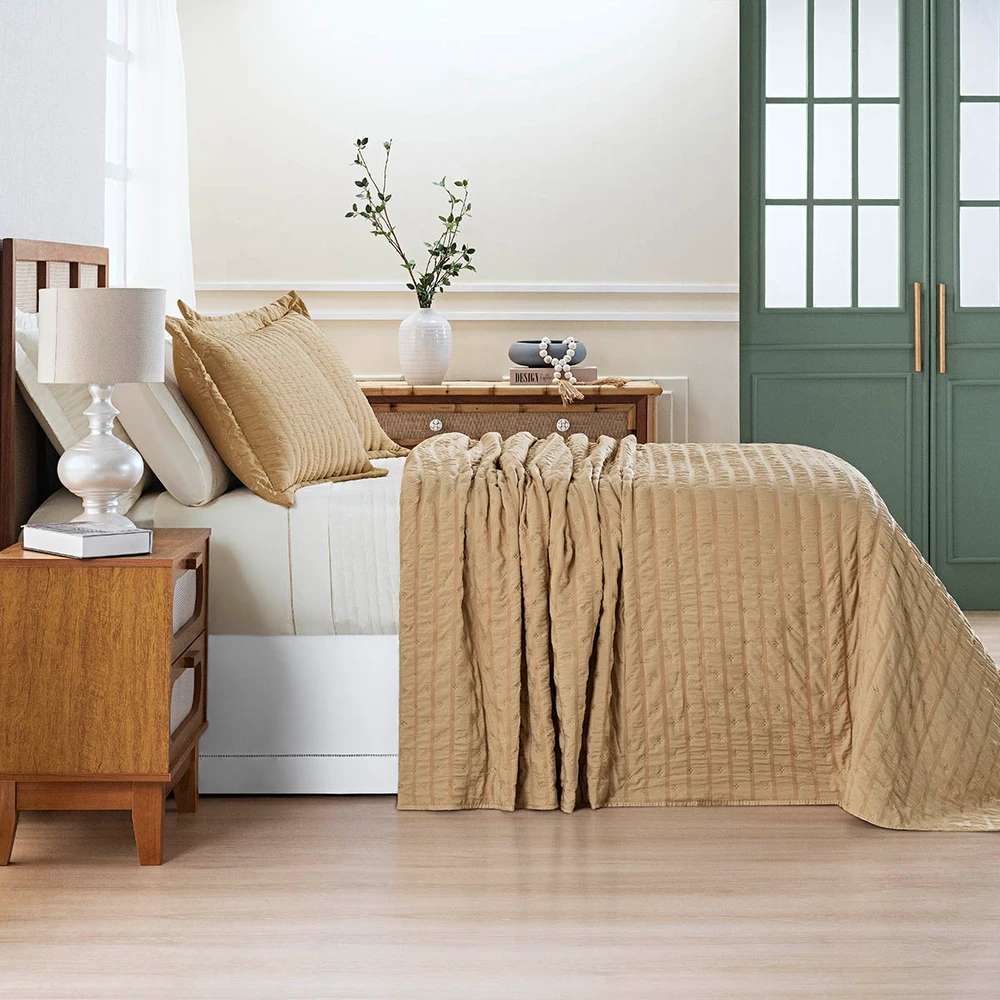 Transforme sua cama em um verdadeiro refúgio de conforto e estilo com o Cobre Leito Plissê. Confeccionado em tecido seersucker com plissado exclusivo, ele cria um efeito visual moderno e sofisticado, valorizando a decoração do quarto com textura e movimento.