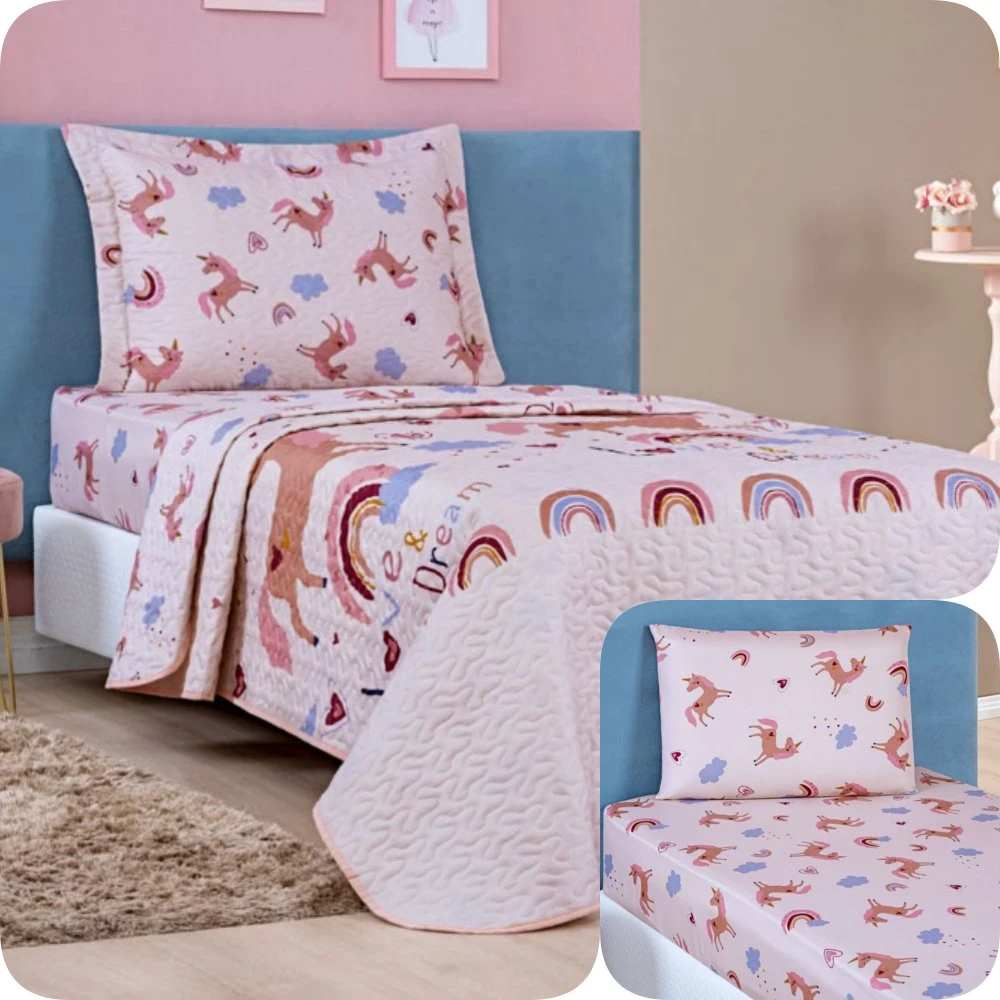 Kit Colcha Solteiro Bouti Kids com Jogo de Lençol - 4 Peças Unicórnio