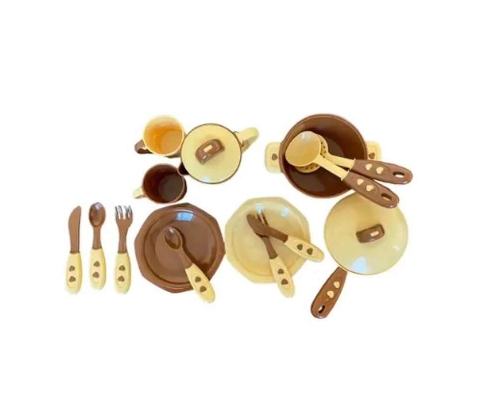 Contém1 Panelinha com tampa1 Leiteira com tampa1 Frigideira2 Pratos2 Xícaras2 Facas2 Garfos2 Colheres1 Concha1 Espumadeira.