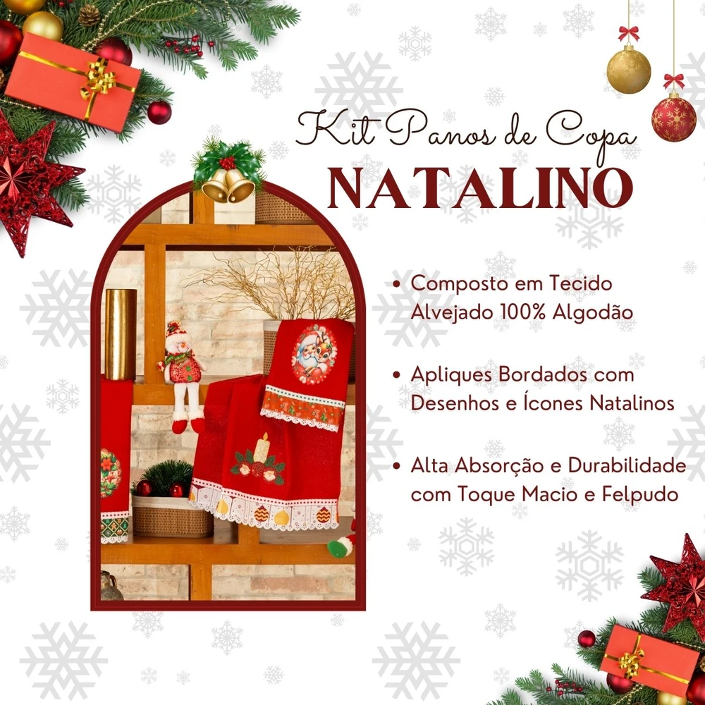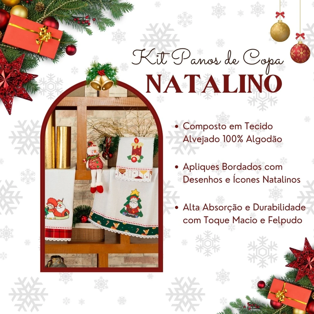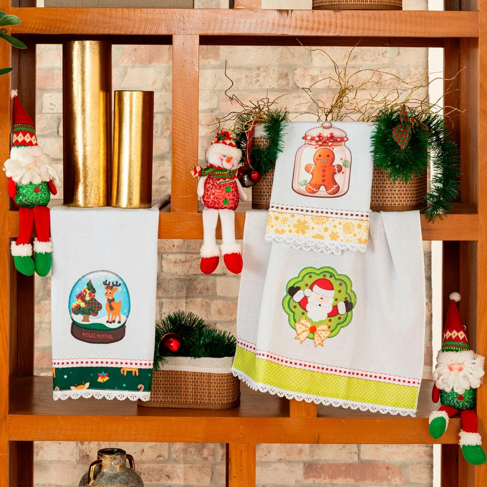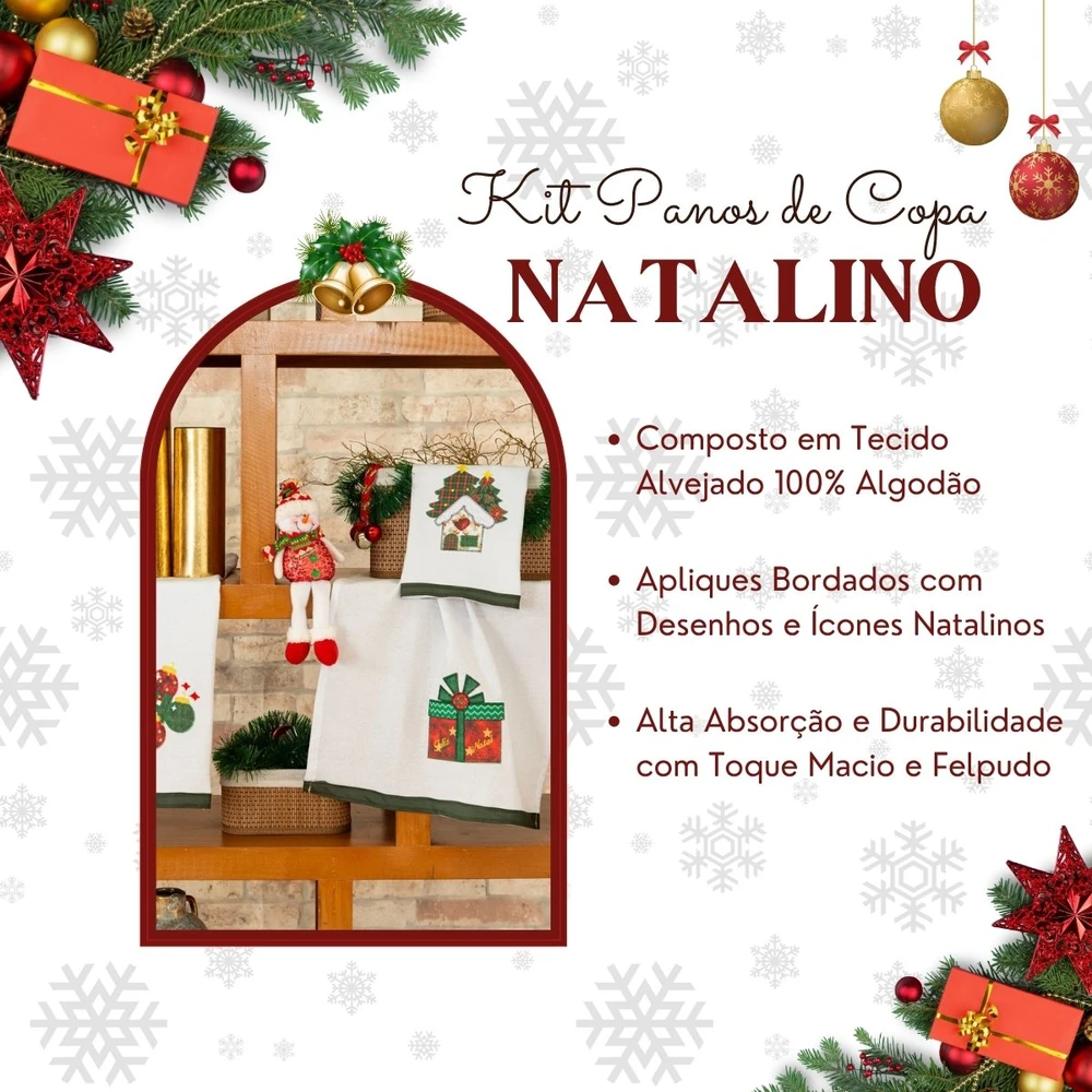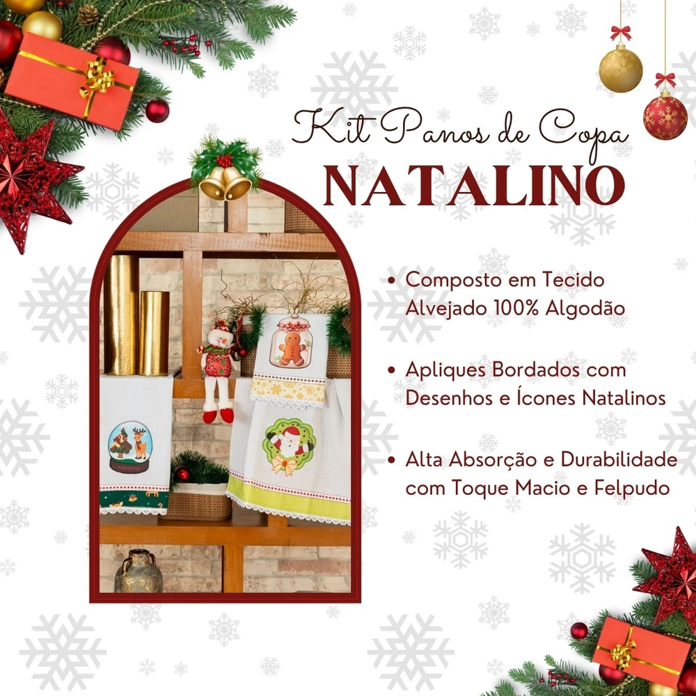 Traga a magia e o calor do Natal para a sua cozinha com este encantador Kit de Panos de Copa Natalinos. Este conjunto é a união perfeita entre funcionalidade e decoração, ideal para a época mais festiva do ano. O jogo é composto por 3 peças, todas em um tamanho excelente de 66cm x 45cm, garantindo alta absorção e praticidade no dia a dia. Confeccionados em tecido alvejado 100% algodão, eles possuem um toque macio e são extremamente duráveis. O grande destaque fica por conta dos lindos apliques bordados que apresentam o tema natalino, com desenhos festivos de Papai Noel, Bonecos de Neve, Velas e Árvores de Natal. Além de úteis para as tarefas da cozinha, estes panos servem como uma charmosa peça de decoração, embelezando o seu ambiente e preparando sua casa para as celebrações. Adquira este kit e celebre o Natal com estilo, ou presenteie quem você ama com este item essencial e festivo!