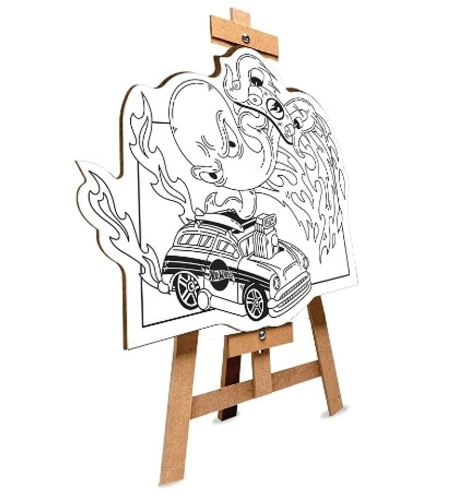 Monte o cavalete e deixe os pequenos soltarem o artista que está dentro deles, colorindo os quadros com desenhos já estampados do universo radical de Hot Wheels.
