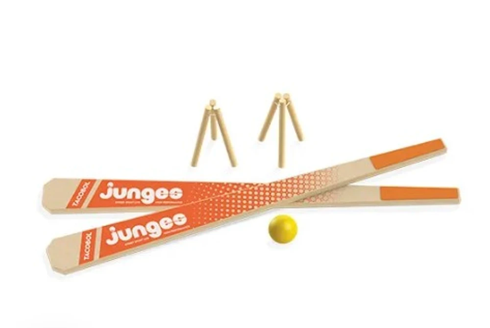 Kit De Tacos Bets Junges Kit De Tacos Bets Junges Kit com 2 tacos em madeira de MDF 15mm e cabo emborrachado. Acompanham 2 casinhas e 1 bola de borracha nº 3.Embalagem sacola em PVC com alça Indicado para crianças +7 anos