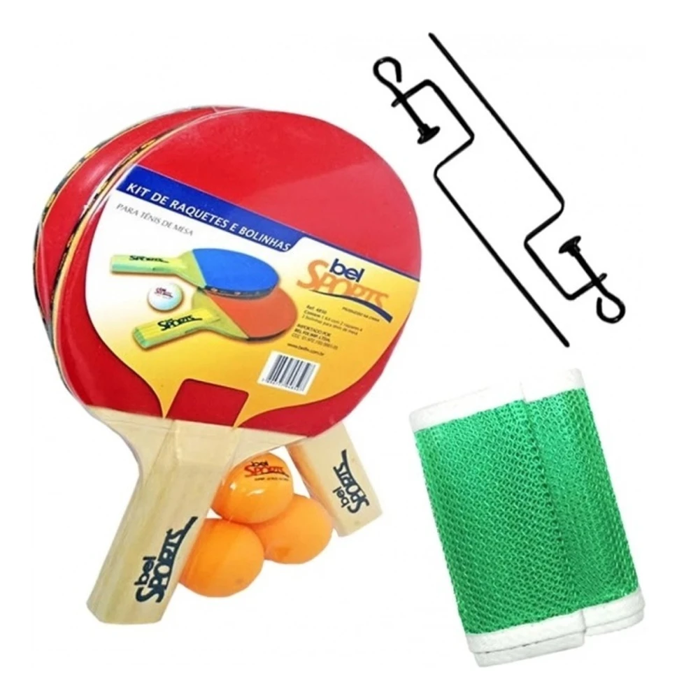 O kit suporte para tênis de mesa com 2 raquetes e bolas BEL é ideal para a iniciação ao tênis de mesa ou ping-pong mais popularmente conhecido. Com este kit completo você conseguirá dominar os primeiros efeitos do esporte!Informações:· Raquetes fabricadas com madeira Álamo e revestimento em EVA, 2 mm - liso· Material suave que proporciona um melhor controle da bolinha· Acompanha 3 bolinhas 40 mm· Para mesas com espessura de Até: 38 mmMedidas:· Rede (CxA): 1,50 m x 12 cm· Altura do suporte: 14,2 cm - 19 cm · Raquete (CxLxA): 25,5 cm x 15 cm x 1 cm
