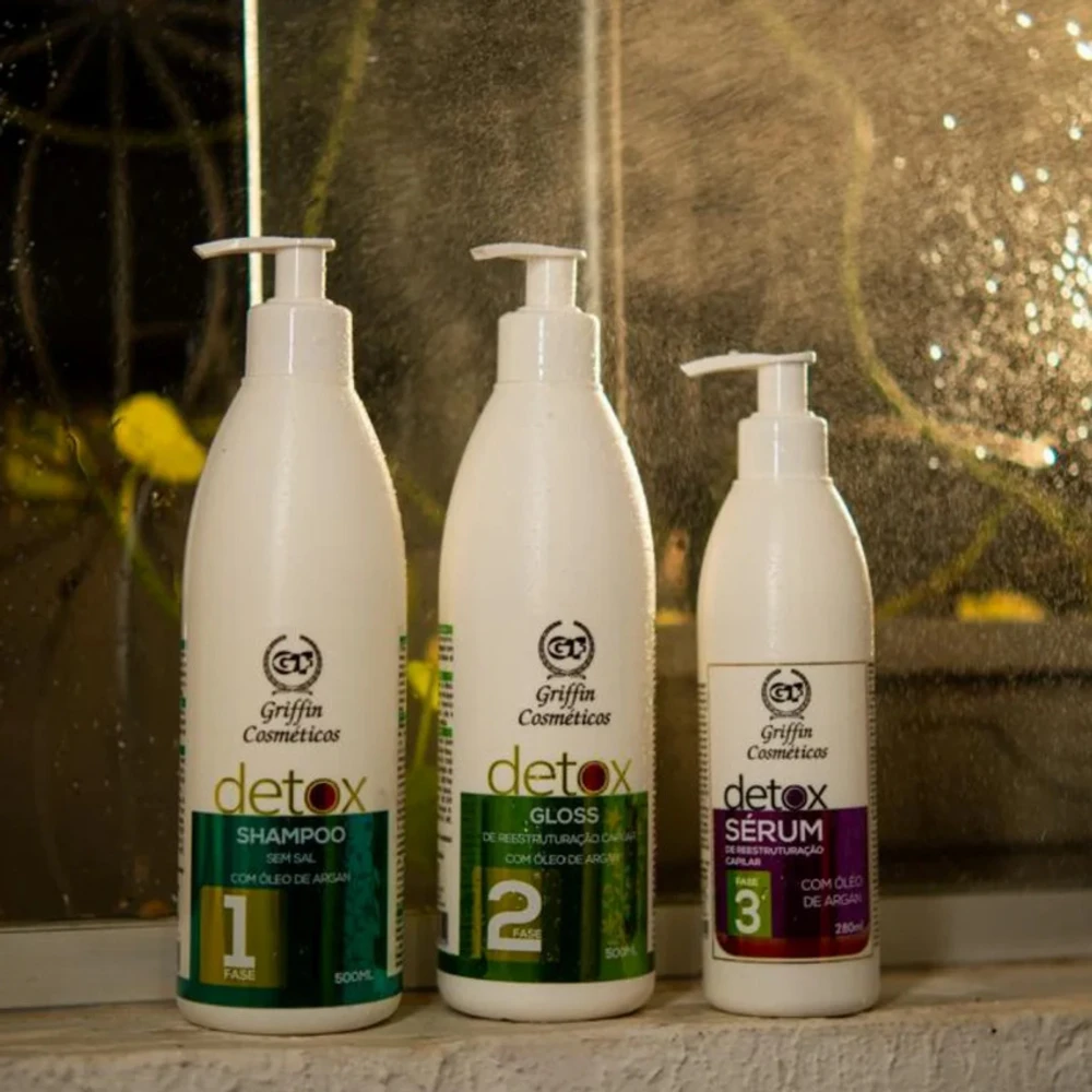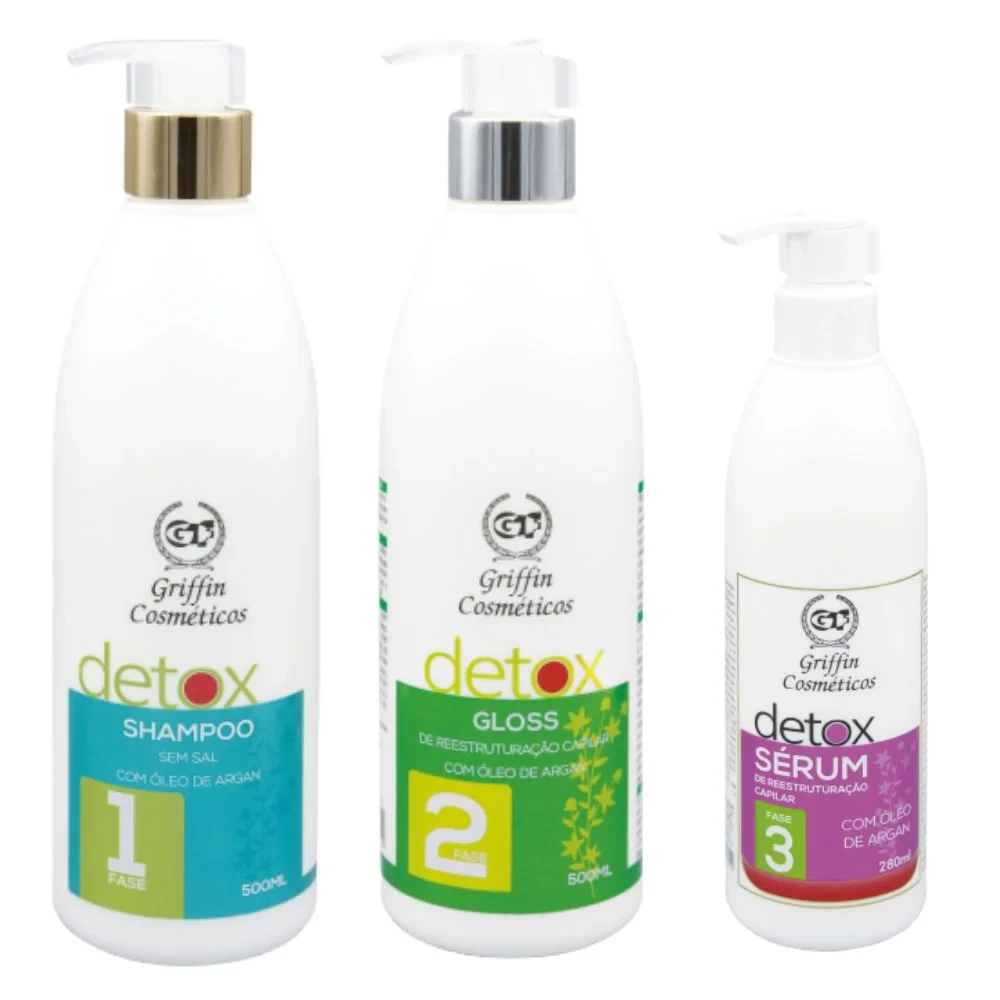 Descubra o poder do Kit Detox de Reestruturação Capilar Griffin, formulado com óleo de argan para transformar cabelos danificados em fios saudáveis, brilhantes e renovados. Ideal para todos os tipos de cabelo, este kit completo combina três fases essenciais para uma restauração profunda e duradoura.
