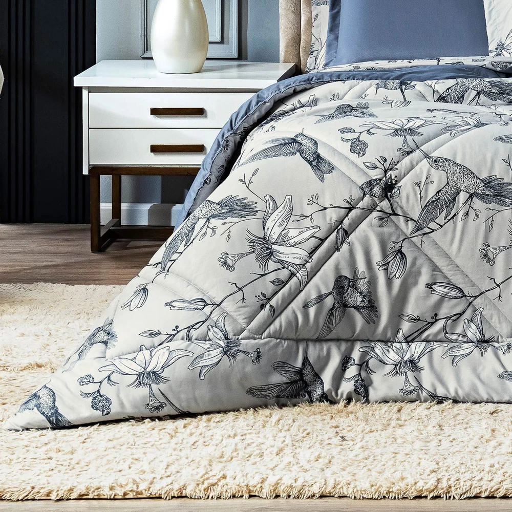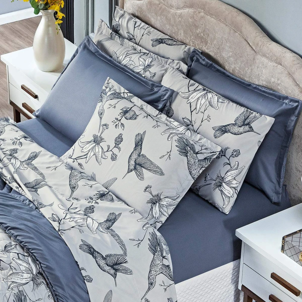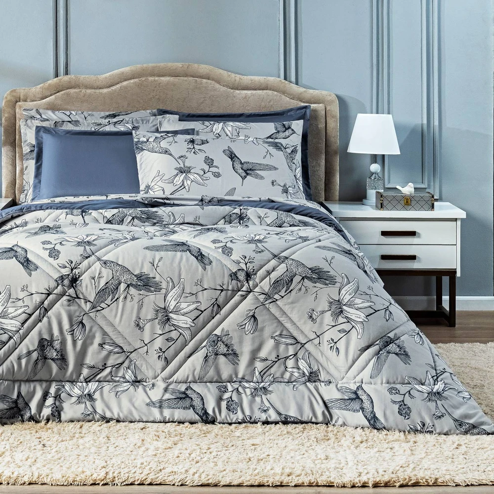 Transforme suas noites em uma experiência de conforto e estilo com o nosso Kit Edredom Beija-flor. Este conjunto irá transformar o seu quarto em um refúgio de tranquilidade e elegância. Feito com tecido em percal de 300 fios acetinado, este edredom é luxuosamente macio ao toque, proporcionando uma sensação de abraço aconchegante. Seu design dupla face oferece versatilidade, permitindo que você mude a decoração do seu ambiente com apenas um movimento. De um lado, um belo padrão de beija-flores em tons de azul e cinza, e do outro, uma elegante tonalidade sólida em azul petróleo liso, garantindo que seu quarto esteja sempre na moda. Além disso, o conjunto inclui dois porta travesseiros estampados combinando, completando o visual harmonioso do seu espaço de descanso. A estampa delicada de beija-flores traz um toque de natureza e serenidade ao seu ambiente, enquanto os tons suaves de azul e cinza adicionam sofisticação e tranquilidade. Prepare-se para noites de sono revigorantes e sonhos tranquilos com este kit. Transforme seu quarto em um santuário de conforto e beleza, onde você pode relaxar e recarregar suas energias. Confira!