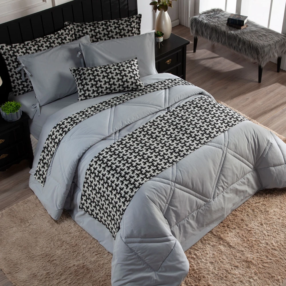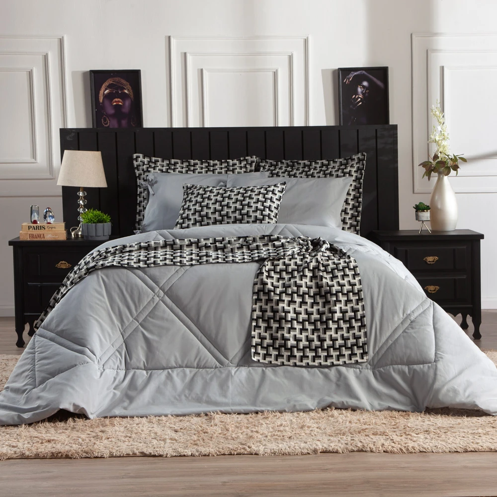 A nova coleção Áquila traz toda a sofisticação, luxo e aconchego. Por possuírem dupla face, apresentam superfície que valoriza ainda mais as cores, podendo utilizar os dois lados do Edredom! Confeccionado em pantográfica computadorizada com lindos desenhos geométricos no edredom! Composto em tecido Percal 200 Fios 80% algodão super macio com 200g de enchimento, agregando ainda mais para seu conforto! Acompanhando o jogo de lençol com duas fronhas com detalhes no acabamento em Lacinho super moderno e elegante, e também o lençol de cima com barrado estampado em Jacquard! Ideal para decorar, trazer conforto e tornar o quarto ainda mais convidativo e elegante! Confira!
