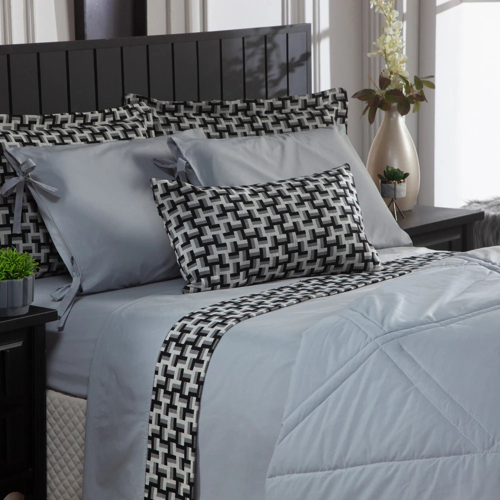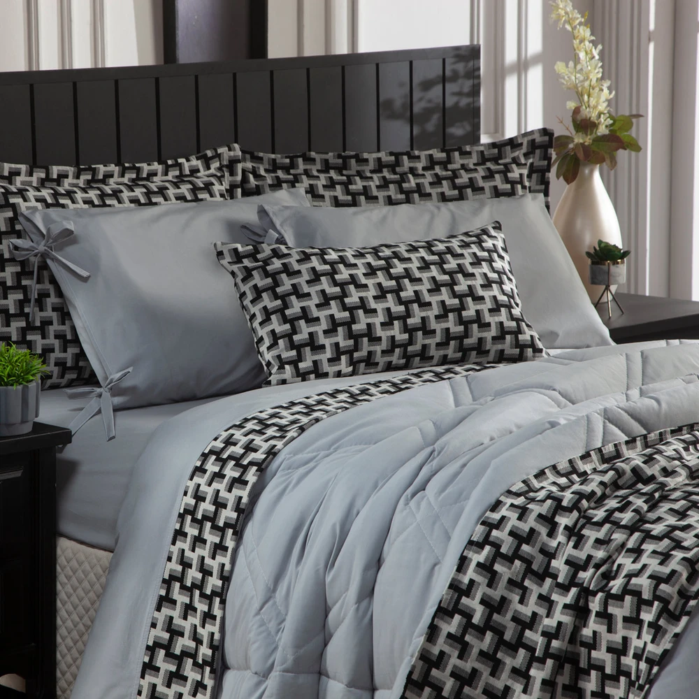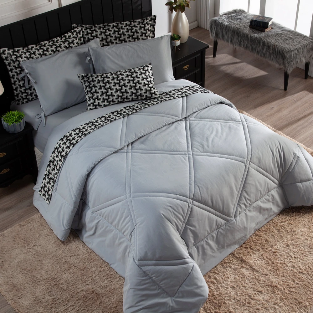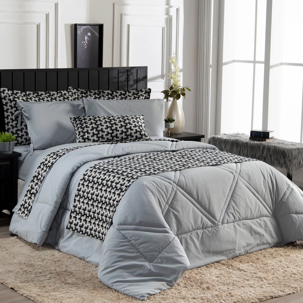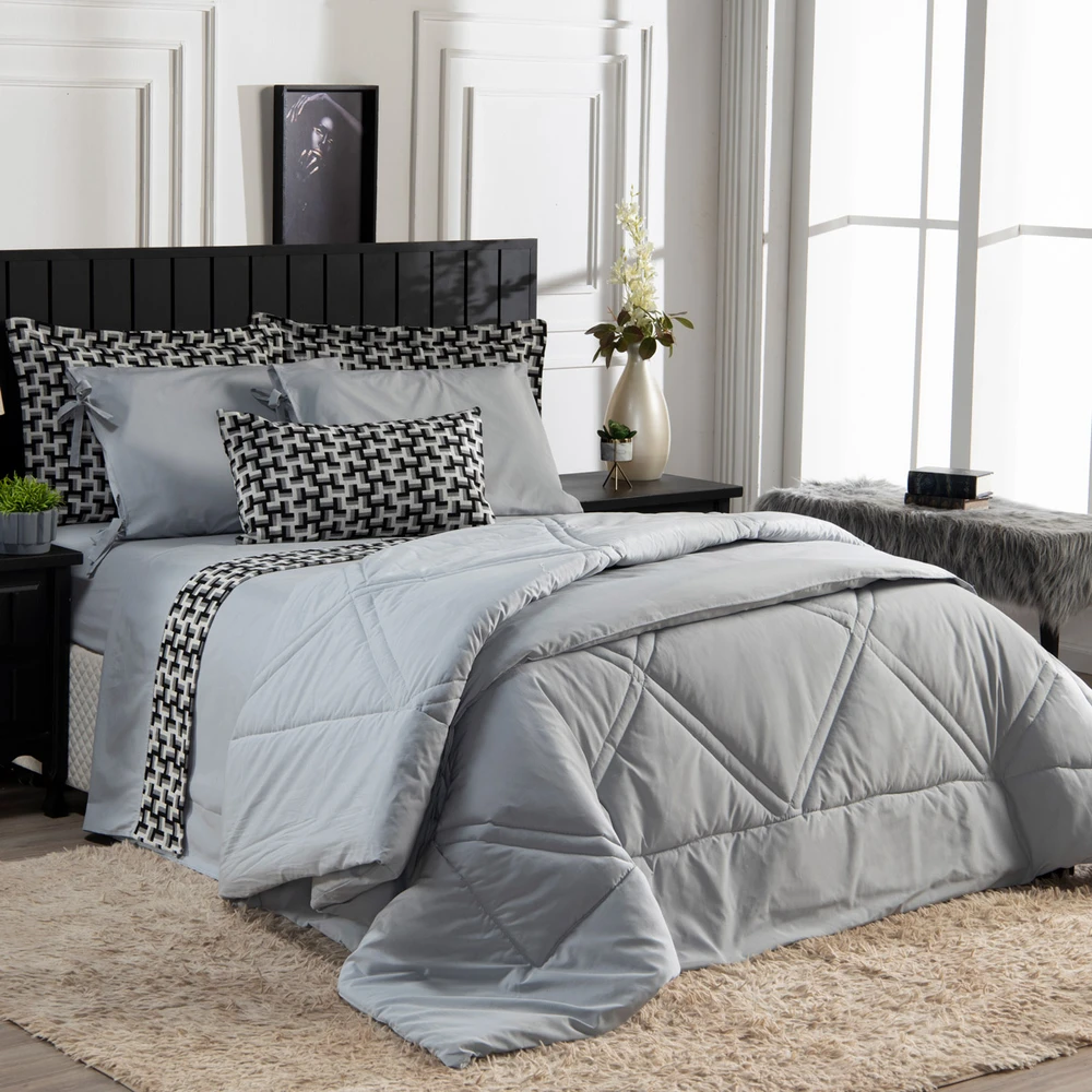 A nova coleção Áquila traz toda a sofisticação, luxo e aconchego. Por possuírem dupla face, apresentam superfície que valoriza ainda mais as cores, podendo utilizar os dois lados do Edredom! Confeccionado em pantográfica computadorizada com lindos desenhos geométricos no edredom! Composto em tecido Percal 200 Fios 80% algodão super macio com 200g de enchimento, agregando ainda mais para seu conforto! Acompanhando o jogo de lençol com duas fronhas com detalhes no acabamento em Lacinho super moderno e elegante, e também o lençol de cima com barrado estampado em Jacquard! Ideal para decorar, trazer conforto e tornar o quarto ainda mais convidativo e elegante! Confira!