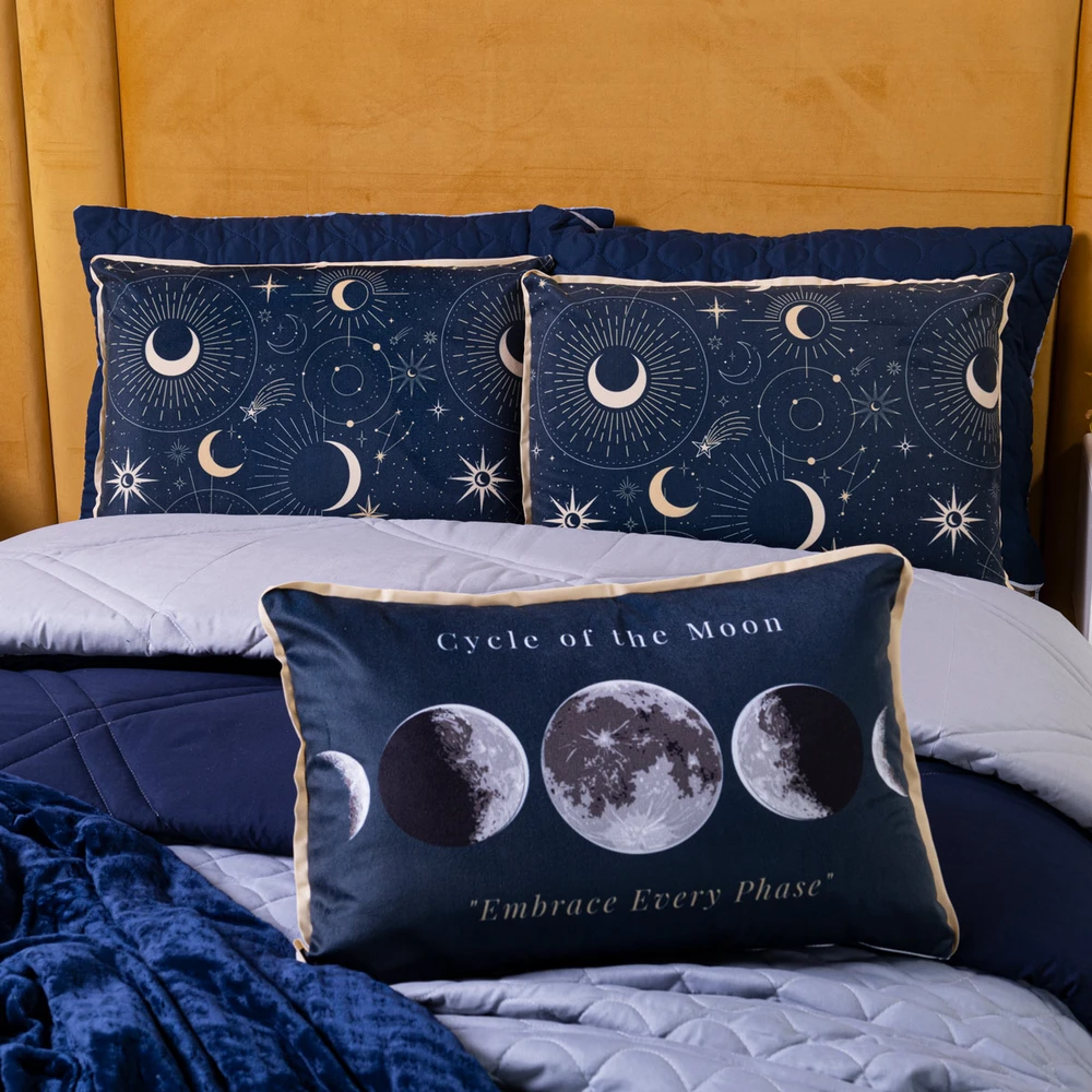 Transforme seu quarto em um verdadeiro universo de conforto e estilo com o Kit Edredom Astros. Confeccionado em Percal de 300 fios, possui toque acetinado, super macio e aconchegante, garantindo noites de sono mais tranquilas. O kit é totalmente temático, trazendo estampas inspiradas em luas, fases da lua, astros e elementos de astronomia, perfeito para quem ama o encanto do espaço sideral. O edredom dupla face conta com costura desenhada em linha feita em máquina pantográfica computadorizada, que adiciona elegância e sofisticação ao acabamento. Já os porta-travesseiros possuem detalhes em debrum e viés, reforçando a delicadeza do conjunto. A almofada retangular estampada complementa a composição, trazendo um charme extra para a decoração. Confira!